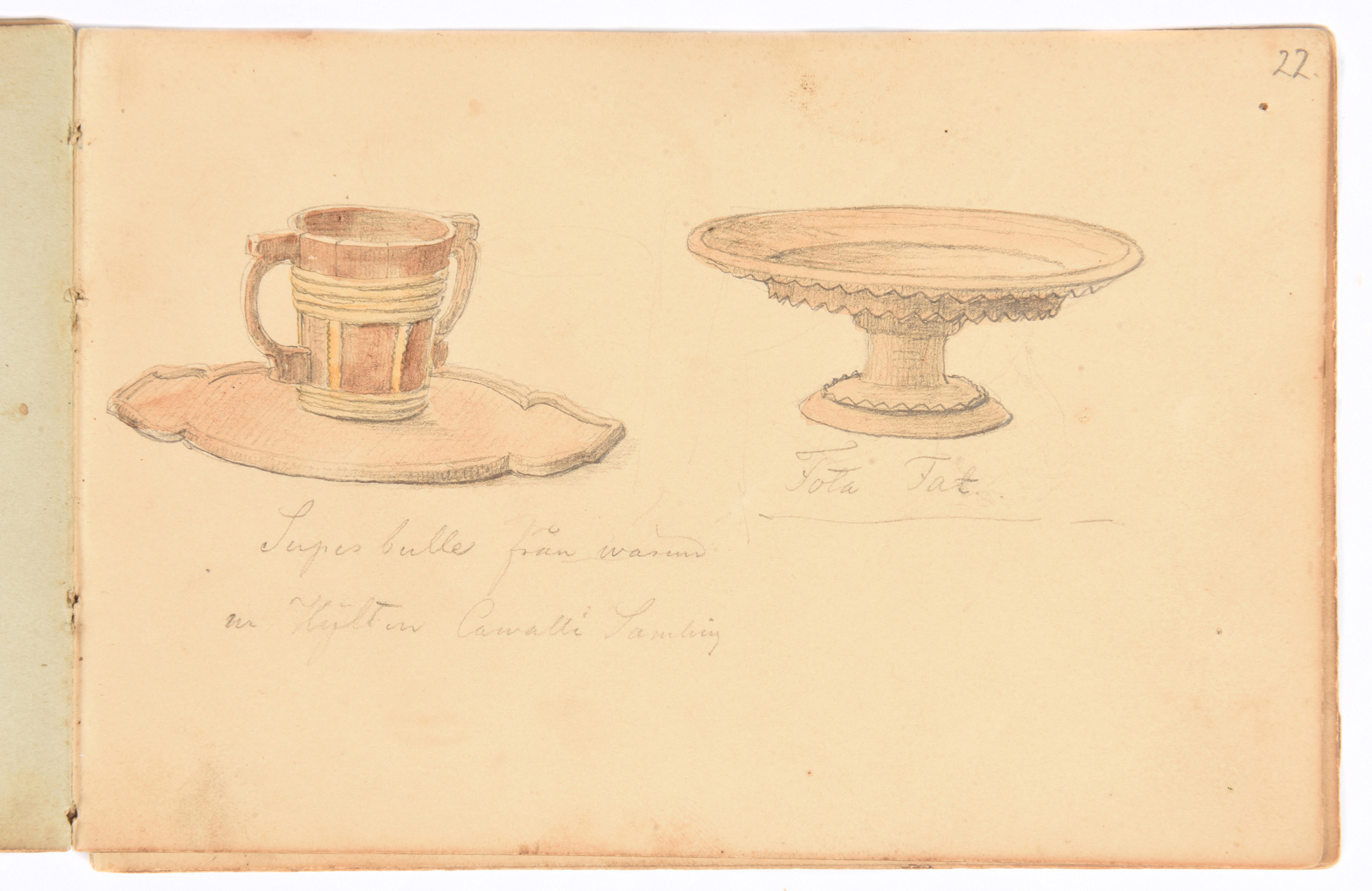 Bokens blad Nr 22, framsidan. Akvarellerad blyertsteckning avbildande ett laggkärl på en bricka och ett smörfat. Skrivet med blyerts i underkant; "Supes bulle från Wären ur Hylltén Cawalli samling" samt "Föla Fat".