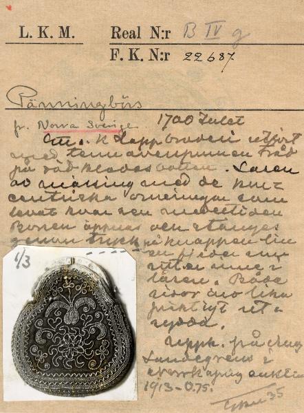 A-S Svakko 2018: Mycket möjligt sytt av en sockenlapp. Sockelapparna tillverkade tenntråd. Sockenlapparna ”blev fast” i vinterlandet. Slaktade hundar och hästar, som inte andra ville slakta. De gjorde tenntråd och höll på med roslöjd. Föremålet kan va tillverkat av same, eller att tråden är tillverkad av sockenlapp. Kanske början av 1700-talet. Penningbörs Hälsingland/Dalarna. Tennbroderi August Landegren fornsamlingar