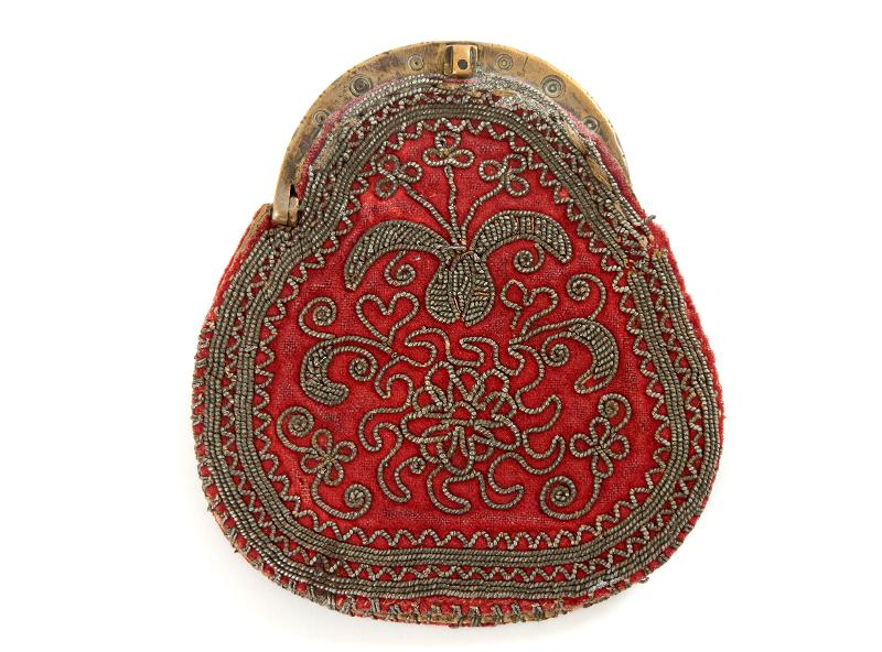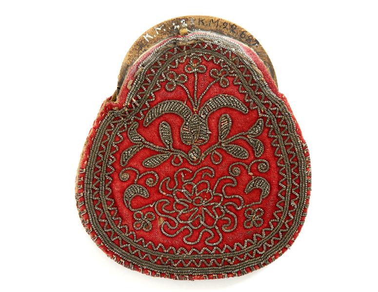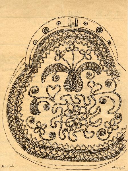 A-S Svakko 2018: Mycket möjligt sytt av en sockenlapp. Sockelapparna tillverkade tenntråd. Sockenlapparna ”blev fast” i vinterlandet. Slaktade hundar och hästar, som inte andra ville slakta. De gjorde tenntråd och höll på med roslöjd. Föremålet kan va tillverkat av same, eller att tråden är tillverkad av sockenlapp. Kanske början av 1700-talet. Penningbörs Hälsingland/Dalarna. Tennbroderi August ...