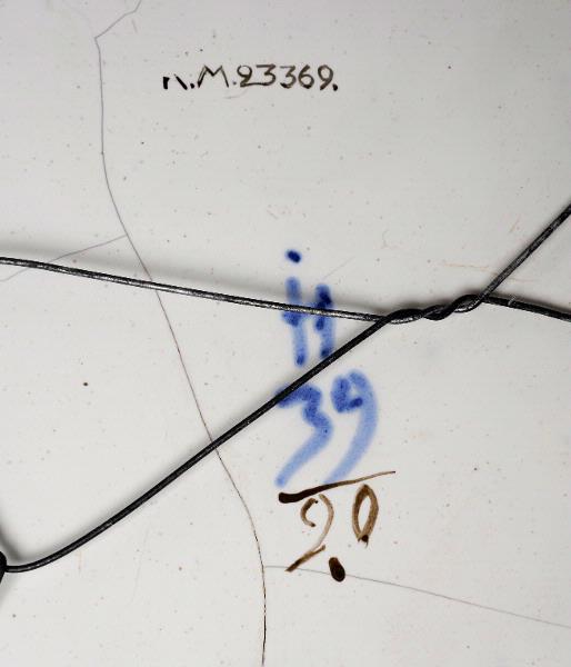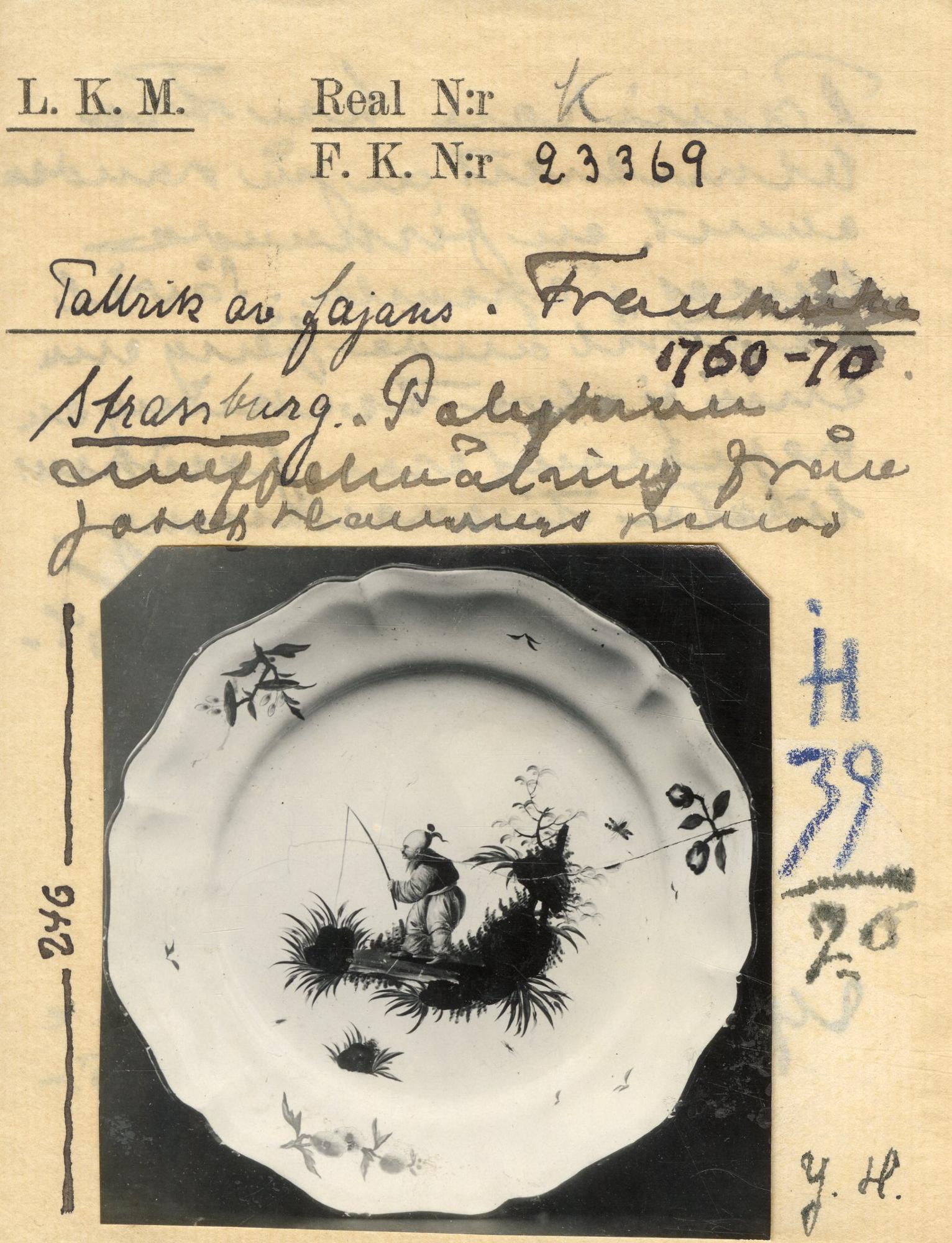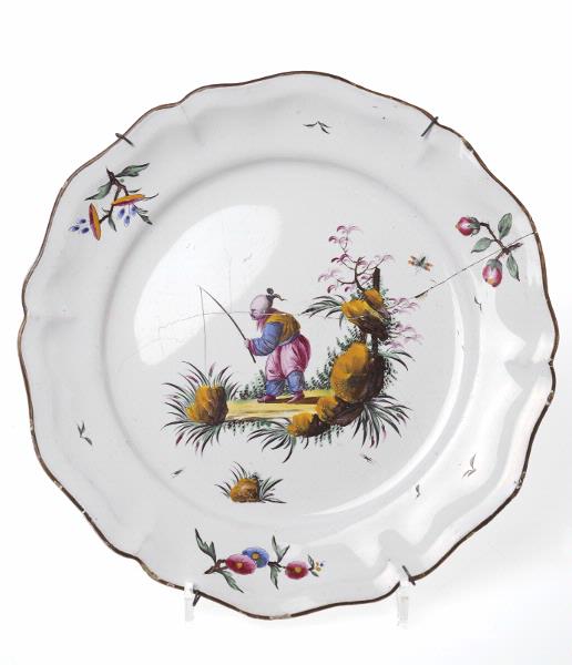 Vågformad kant. Blommor på brättet, i spegeln en man med hårpiska står och fiskar. Vit glasyr med dekor i gult, orange, rosa, blått och grönt. Svartbrun kant.