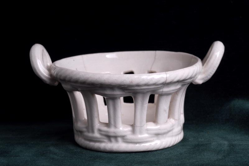 Såssnipan: Oval, bukig med indragen hals. Hög fot fäst på fat. Två grepp. Kupigt lock med blomknopp. Glaserat vitt gods. Bladmönster i relief på greppen, på fatets kanter och locket. Spricka i skålen. Fruktkorgen med genombruten flätning, rund med uppstående öron fästa i överkanten, gulvit glasyr.