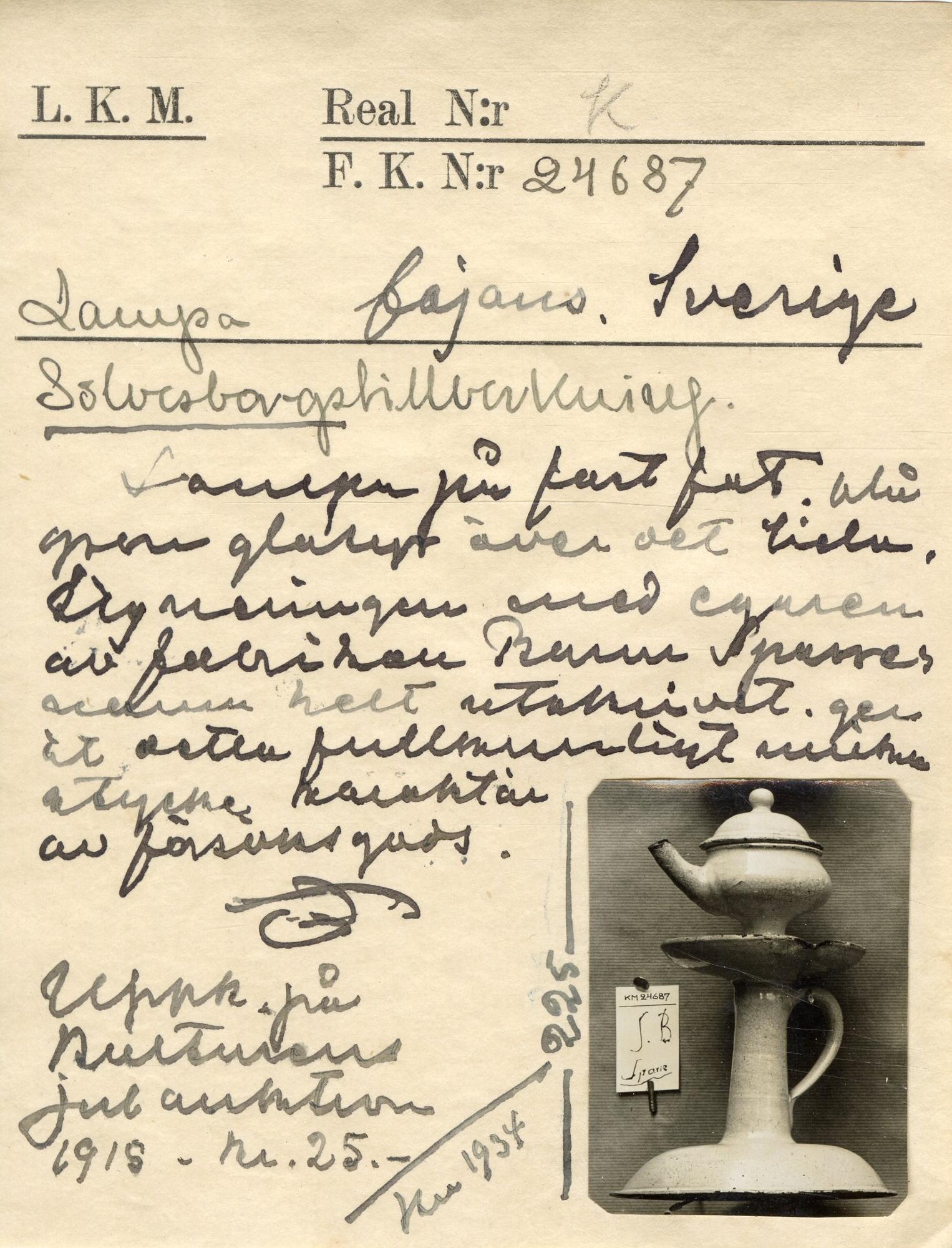 • Uppköpt på museets julauktion d. 17 Dec 1915. Utställning på Kulturen i Lund; 20 oktober 1991- 21 mars 1993. Katalognr SB 1. Färgfoto s. 20. Exempel på den äldsta tilverkningen vid Gabriel Sparres fab... Visa hela