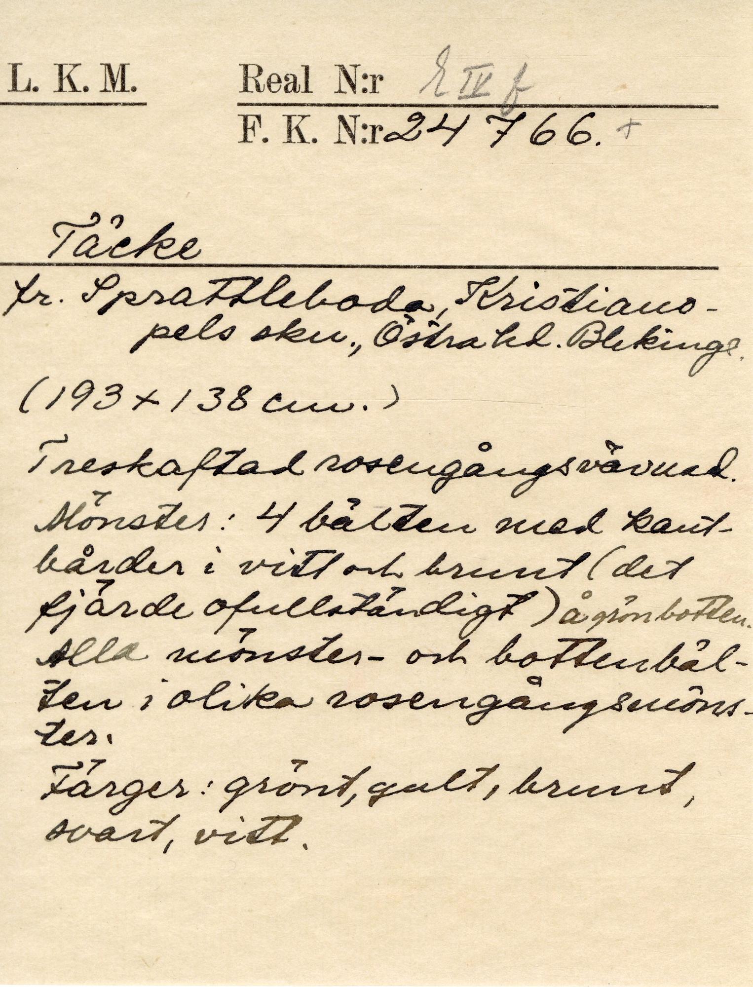 Inslag i ullgarn eventuellt med nöthår, 1 trådigt, S-spunnet. Färger; åtta breda bårder, varannan grön och svart, respektive gul och svart. Mellanbårder i vitt, brunrosa, gult och svart. Mittsöm. Vävbredd: 70 cm.