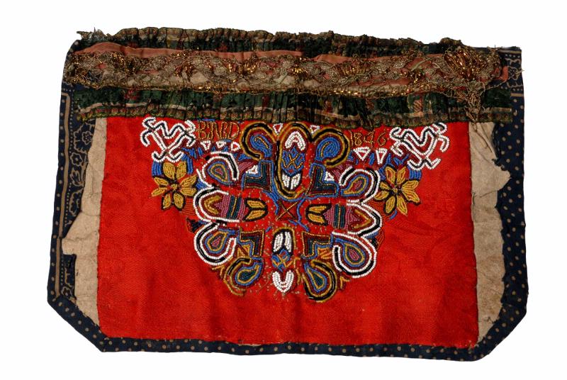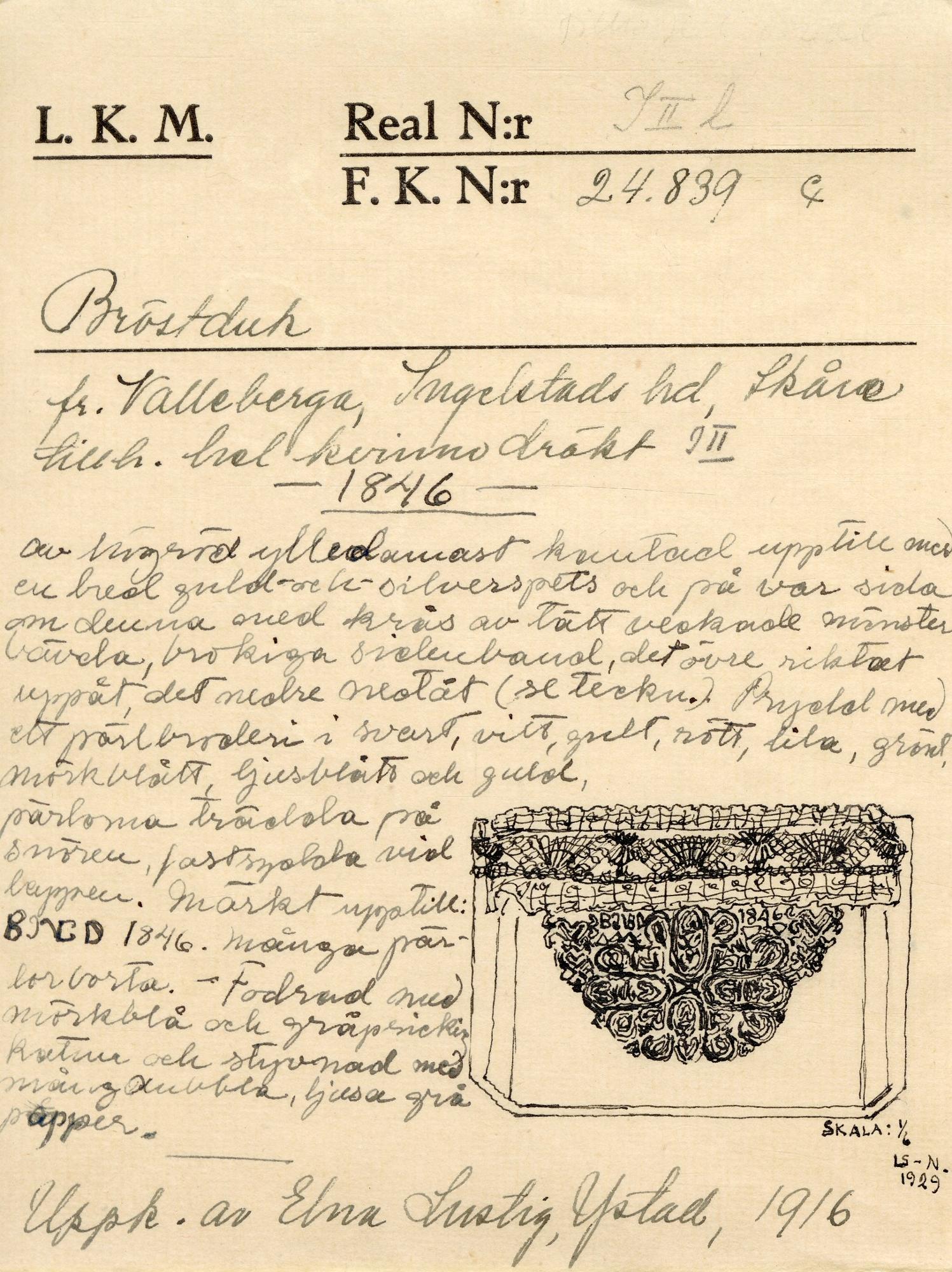 Bröstduk fr. Valleberga, Ingelstads hd, Skåne tillh. hel kvinnodräkt - 1846- av högröd ylledamast kantad upptill med en bred guld- och -silverspets och på var sida om denna med krås av tätt veckade mönstervävda brokiga sidenband, det övre riktat uppåt, det nedre nedåt (se teckn.) Prydd med ett pärlbroderi i svart, vitt, gult, rött, lila, grönt, mörkblått, ljusblått och guld, pärlorna trädda på snören, fastsydda vid lappen. Märkt upptill BND 1846. Många pärlor borta. Fodrad med mörkblå och gråprickig katun och styvnad med mångdubbla, ljusa gråpapper. [avbildad i skala 1:6 på katalogkortet]