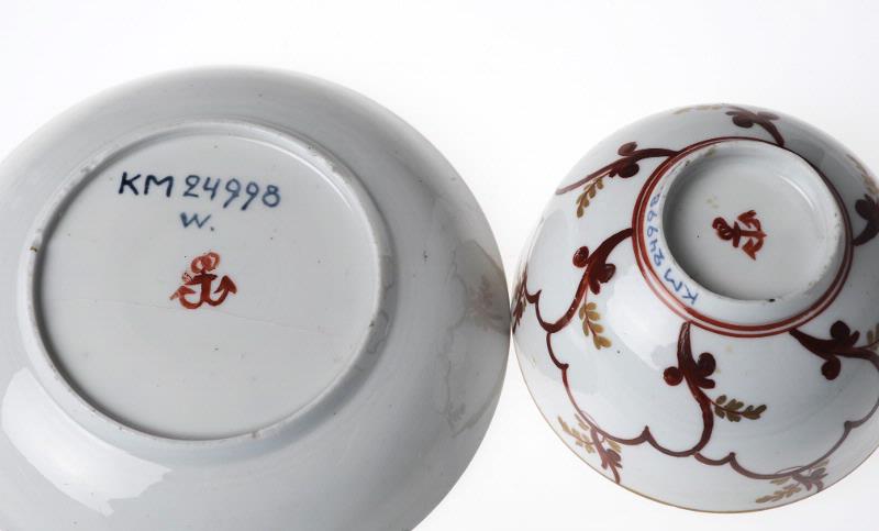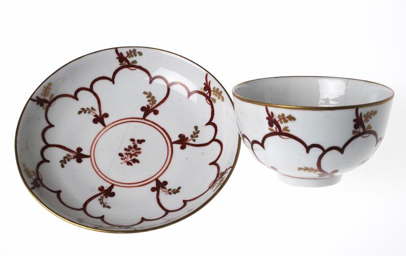 • Öronlös kopp på fotring. Kopp och fat med lika dekor, mörkbrun, tegelröd och guld. Blad och blommor.