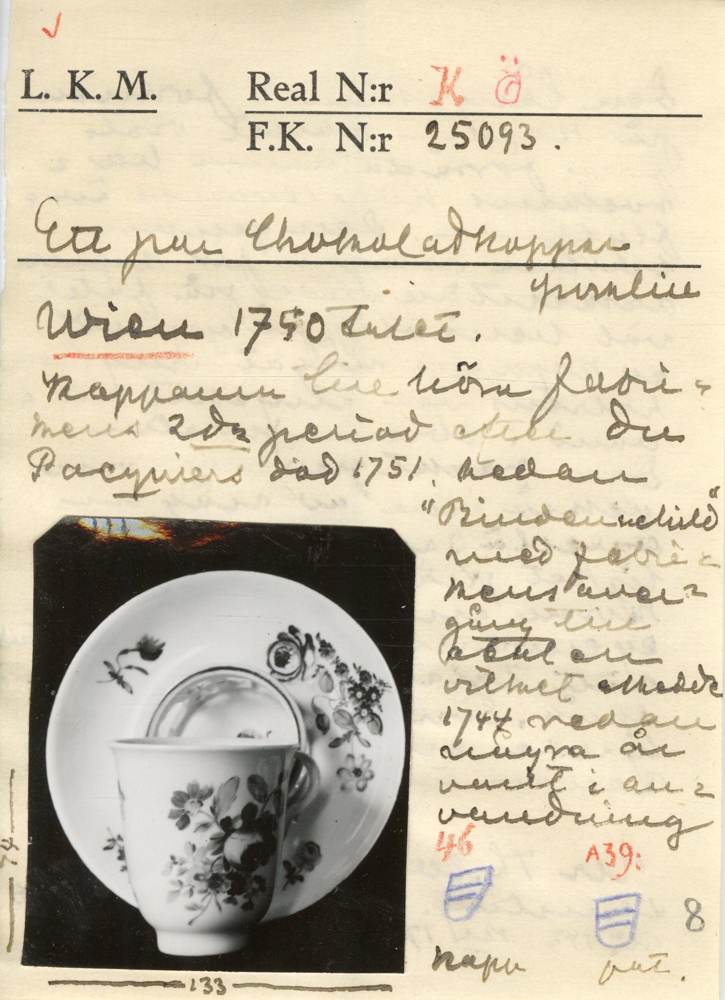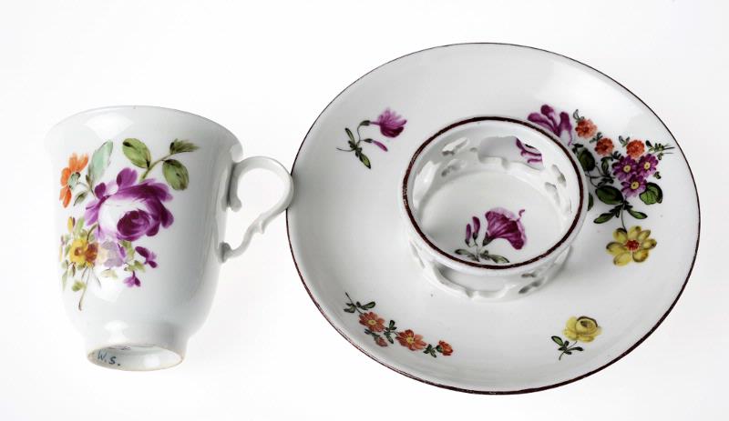 • Med fat. Hög utsvängd bägarform med öronmusselformade grepar. Dekorerad med buketter och blomkvistar i färger. På fatet gallerring för koppen.
