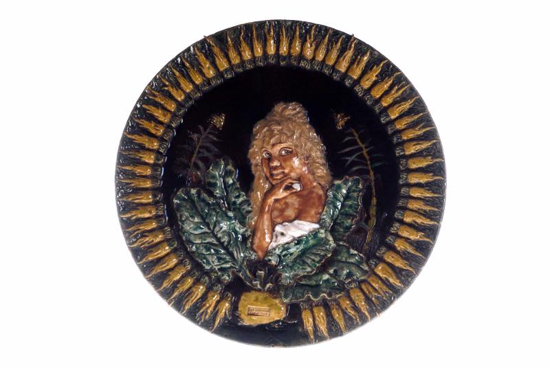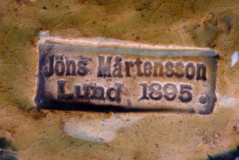 Glaserat i flera färger. Inom en kant av tätt liggande sockerbetor i relief sticker en kvinna i kvartsfigur fram mellan bladen på en sockerbeta; hon håller en sockerbit i handen.