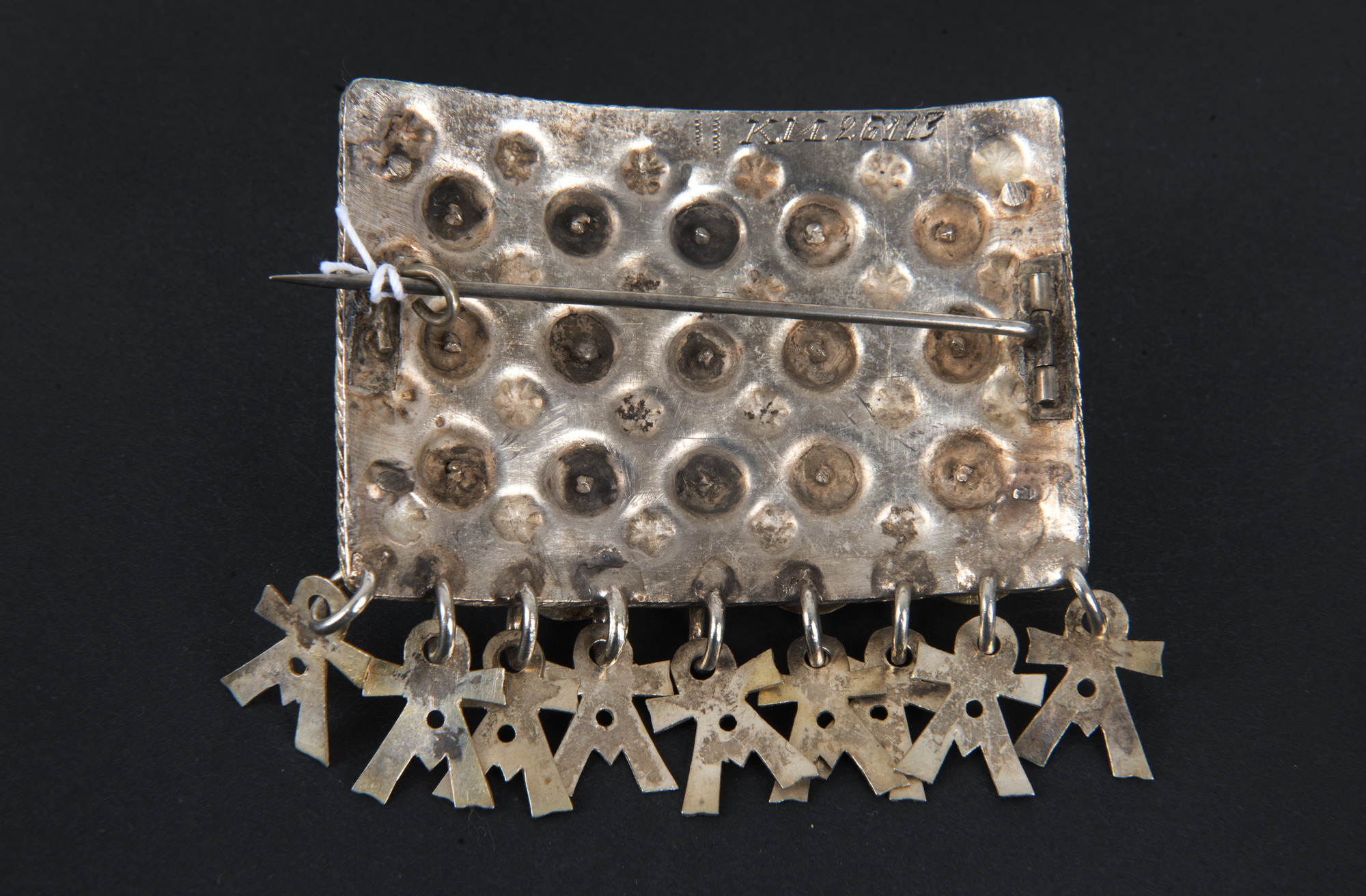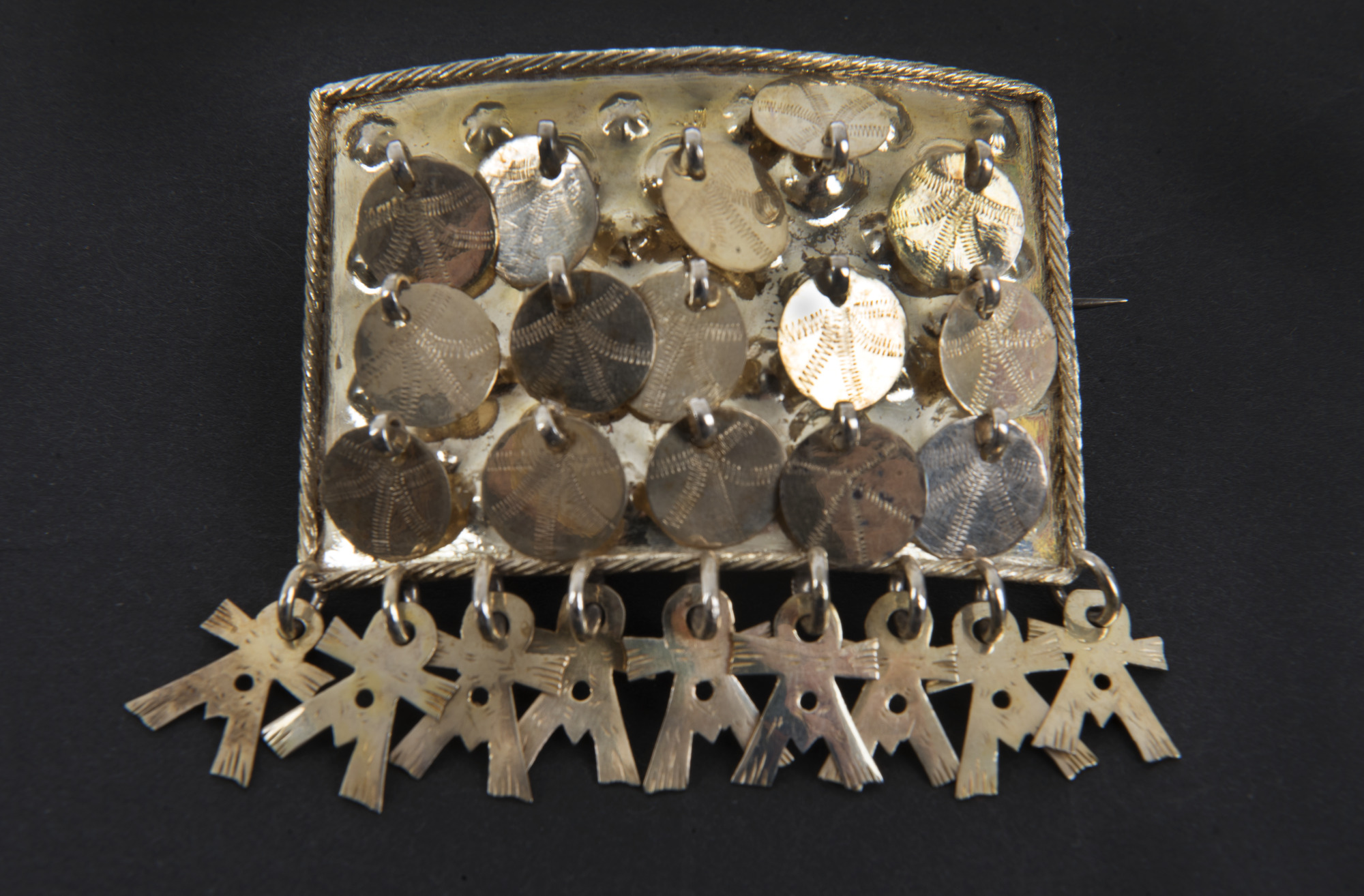 Förgylld framsida med löv. Repstav runt kanten. 15 bucklor i rader om 5 x 3, vardera med ett runt löv med svisselerad dekor. Längs överkanten 6 st mindre bucklor med stjärnmönster, längs nederkanten 9 st Maria-löv. Sekundär, senare nål på smyckets baksida.