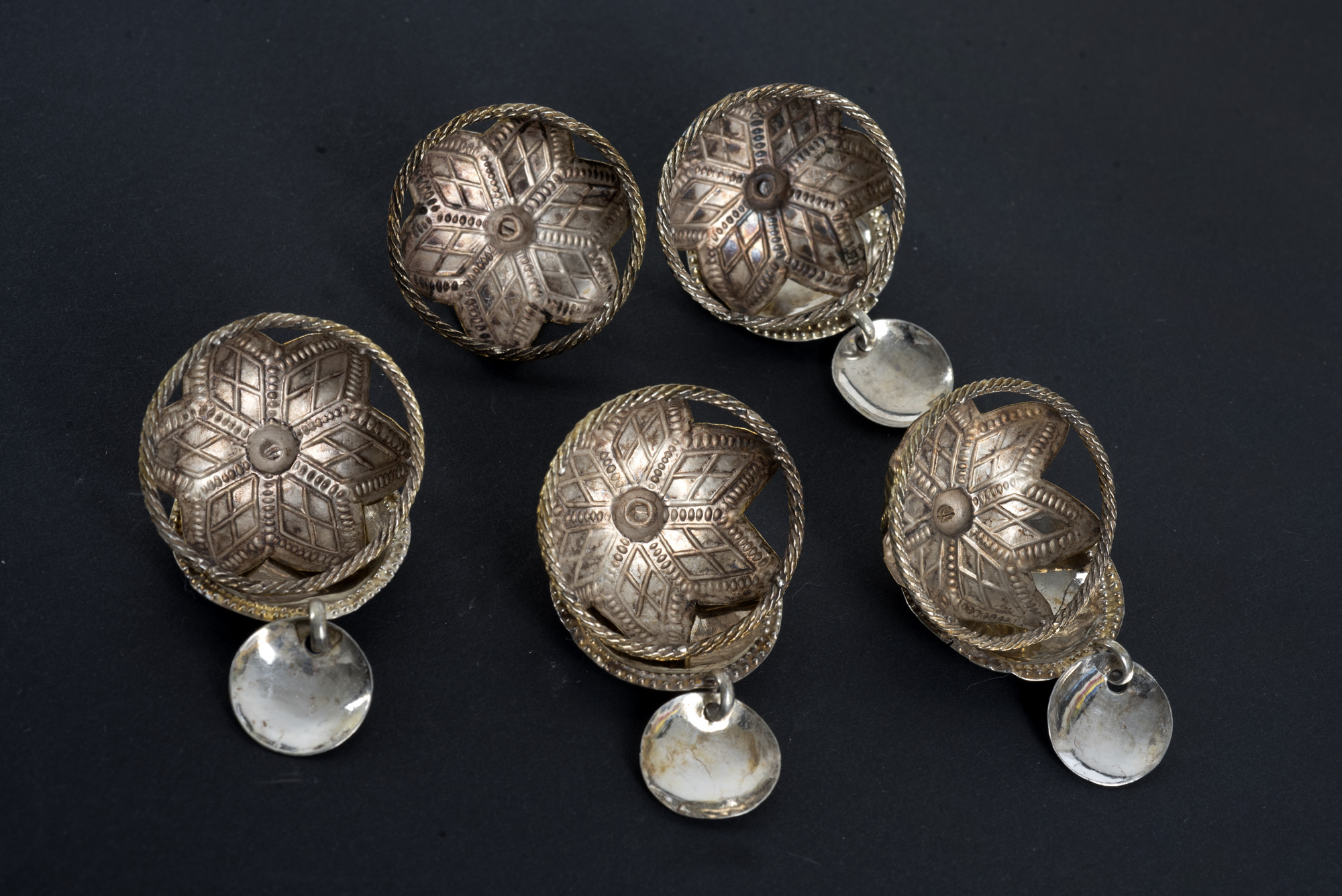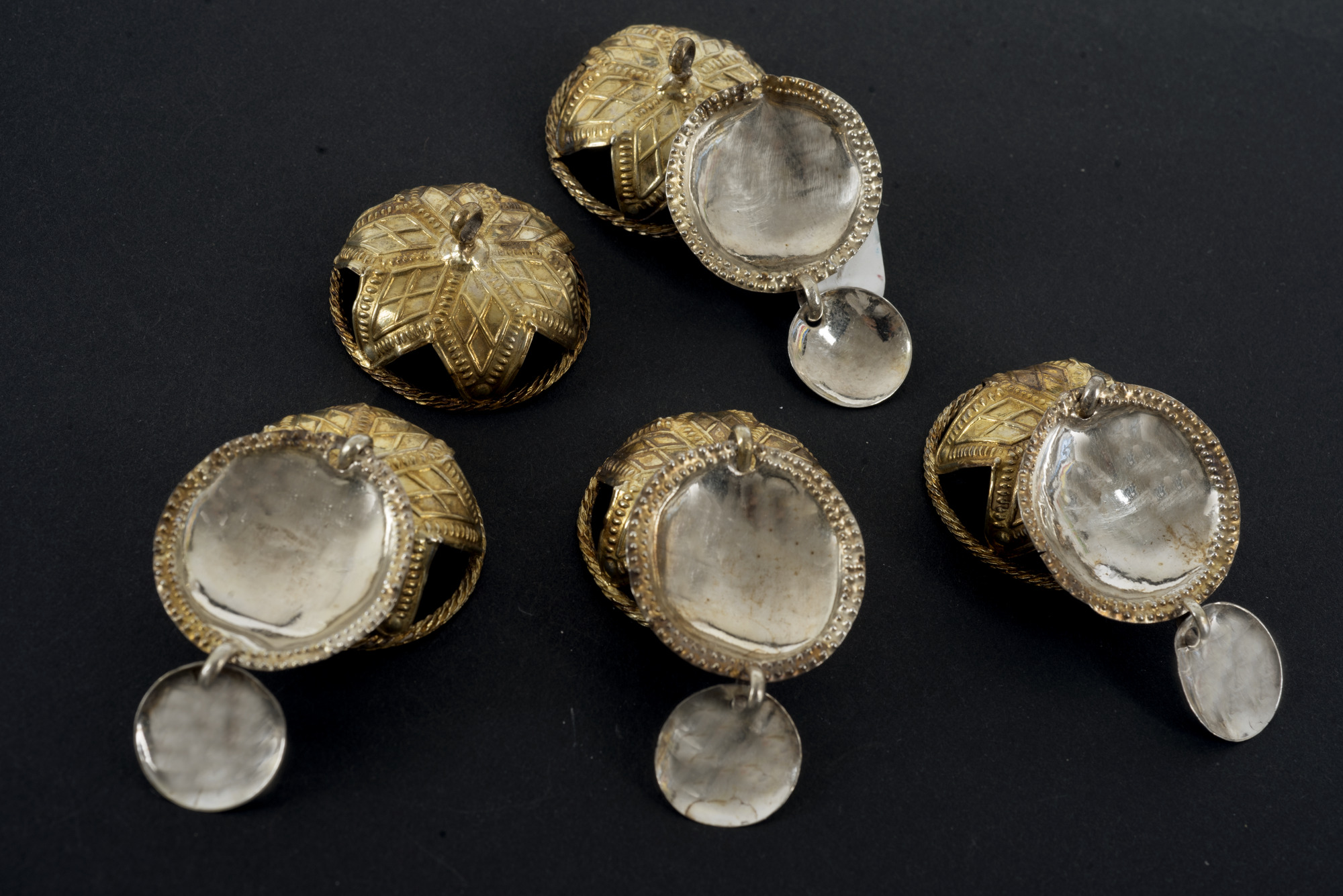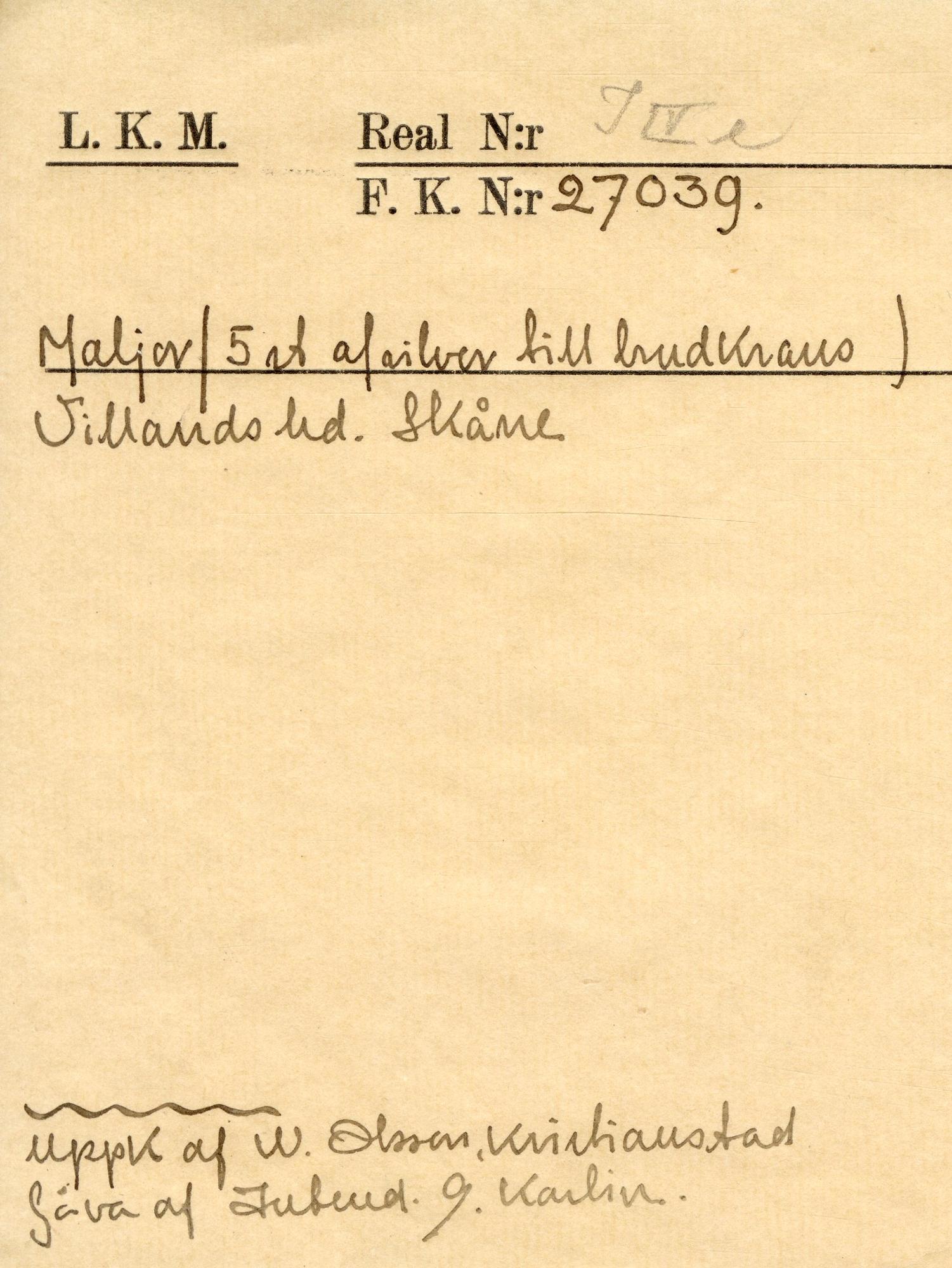 Till brudkrans, huvudlad. Runda maljor med tvinnad ytterring, på den stjärnformade bucklan med pressad och punsad geometrisk dekor är ett runt, skålat löv med dubbel prickrand runt ytterkanten fäst i mitten. På varje sådant löv är ett mindre, runt och skålat odekorerat löv fäst. Framsidan förgylld.