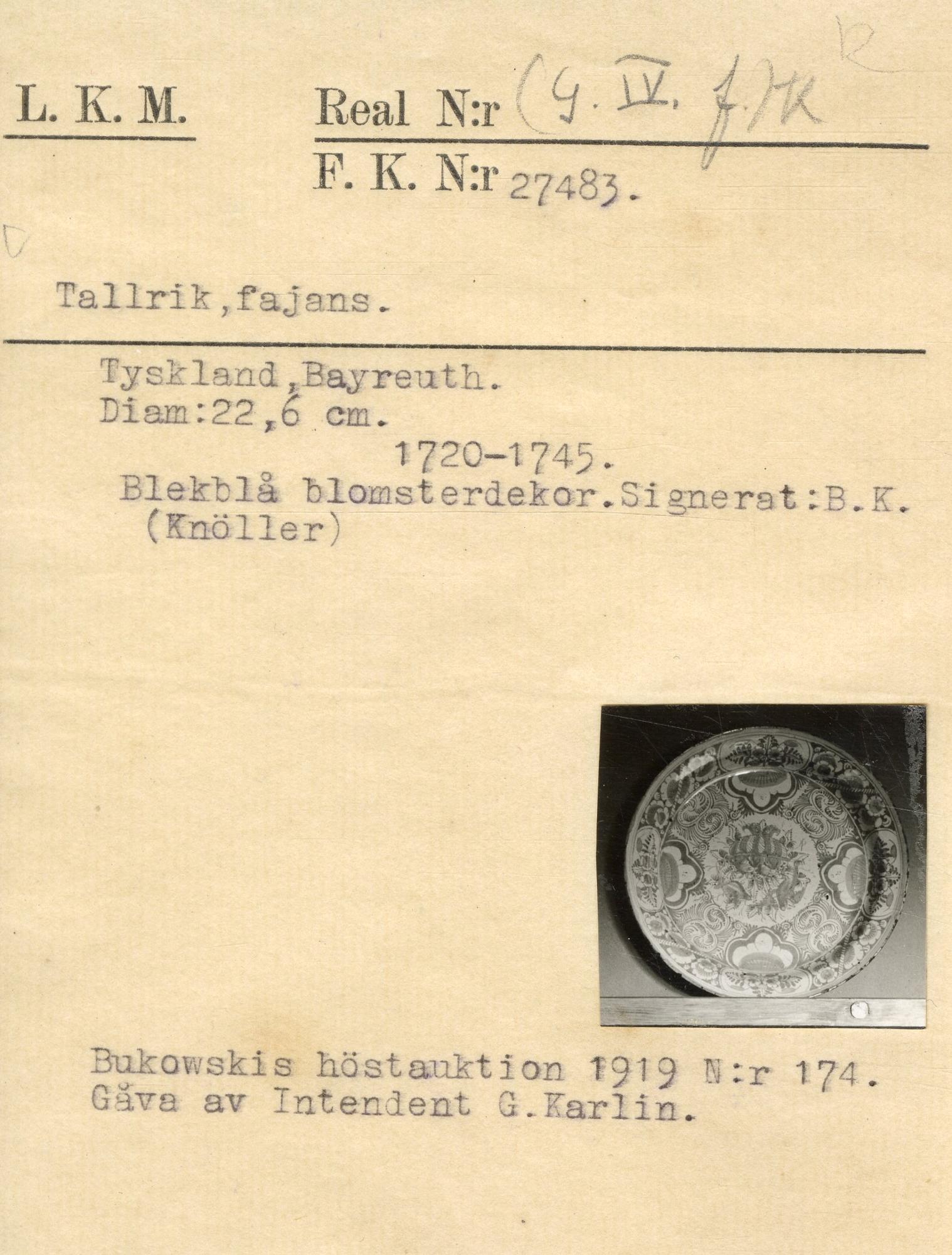 • Signerad: B K/ i [avritat på katalogkort] [bild 2] (visar att tallriken gjorts under Knöllers tid vid fabriken).