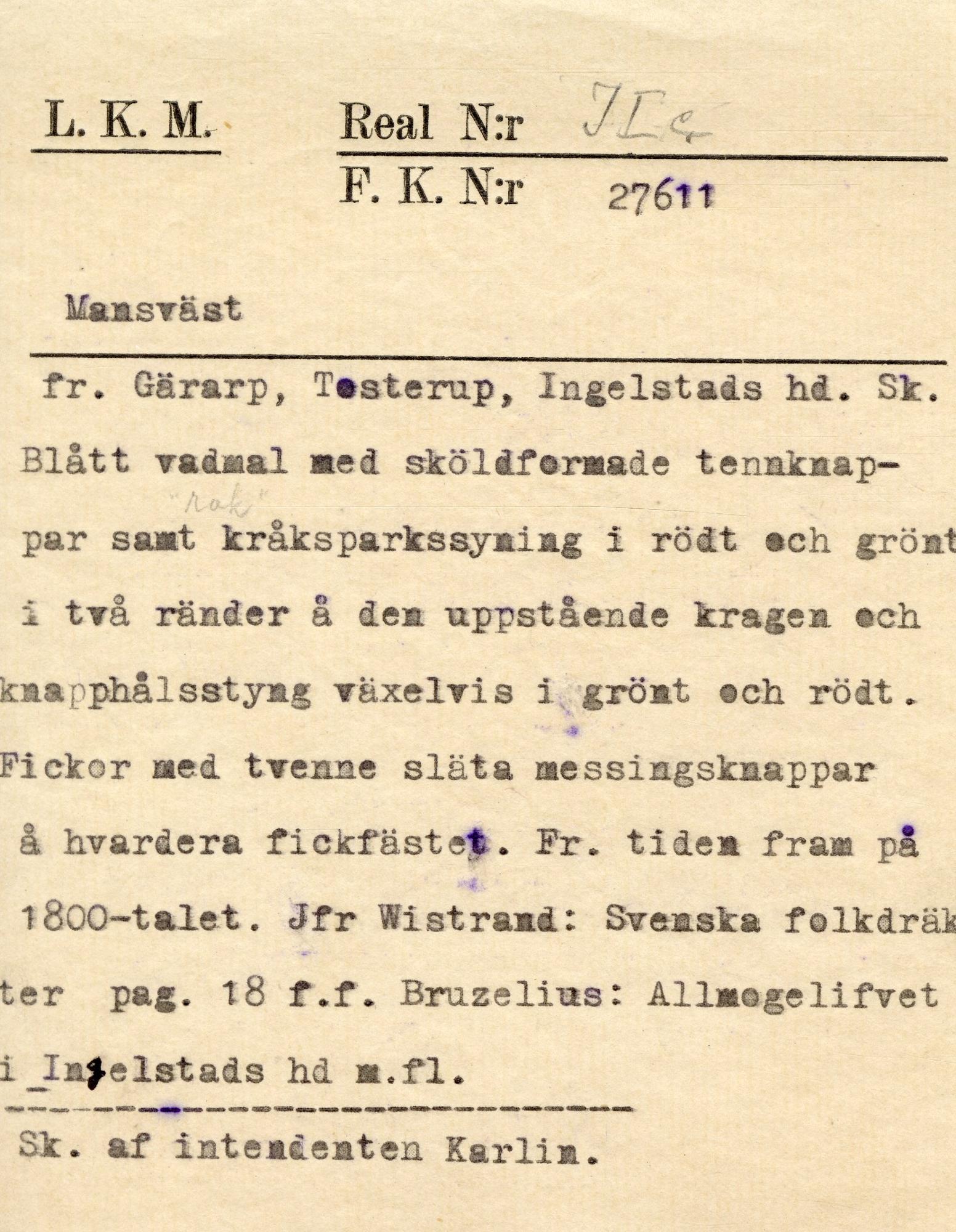Mörkblå vadmal, mittsöm i ryggen. Såväl rygg- som sidoskörten öppna, ryggskjörtens flikar lagda över varandra, alla med dubbla, langetetrade förstärkningstränsar. Knäppes mitt fram med 15 st tämligen stora platta, vita metall knappar liknande dem på KM 27610. Tämlign bred ståndkrage, garnerad med 2 rader häxstygn i rött och grönt lingarn, framtill på kragen2 likadana knappar. En inskuren ficka i var sida med påsydd slå upptill samt med 2 något mindre, släta, en aning kupiga mässingsknappar i vardera ändan. Knapphålen tränsade med vartannat rött, vartannat grönt lingarn. Foder i grov linnelärft.