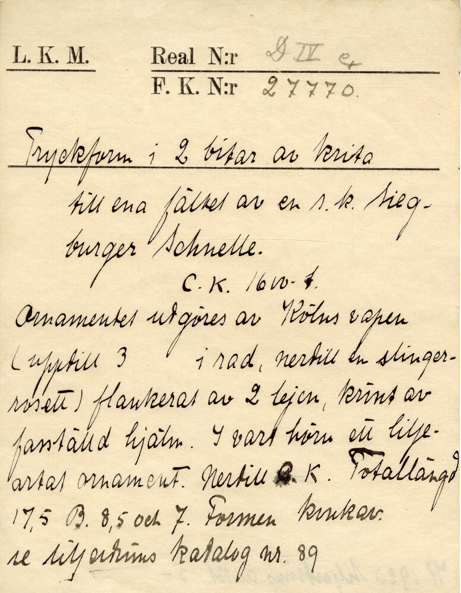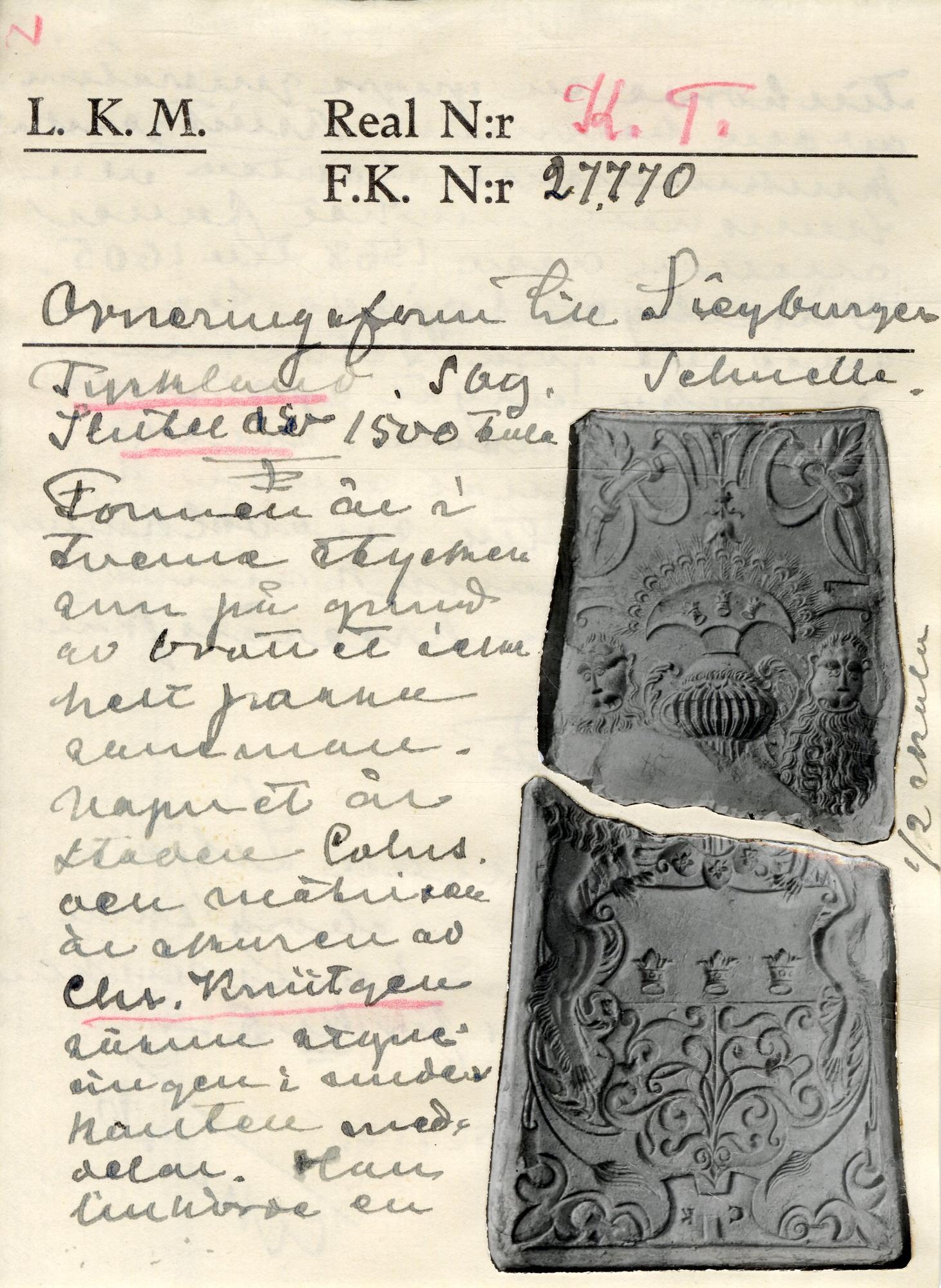 "Matris för dekorering av krus, >Schnelle> med staden Kölns vapen. Signerad C K, Christian Knütgens. Siegburg. H 85 mm." Kulturens årsbok 1958, Kjellberg Sven T, Stengodset från Rhen, s. 102-118, bild s. 103.