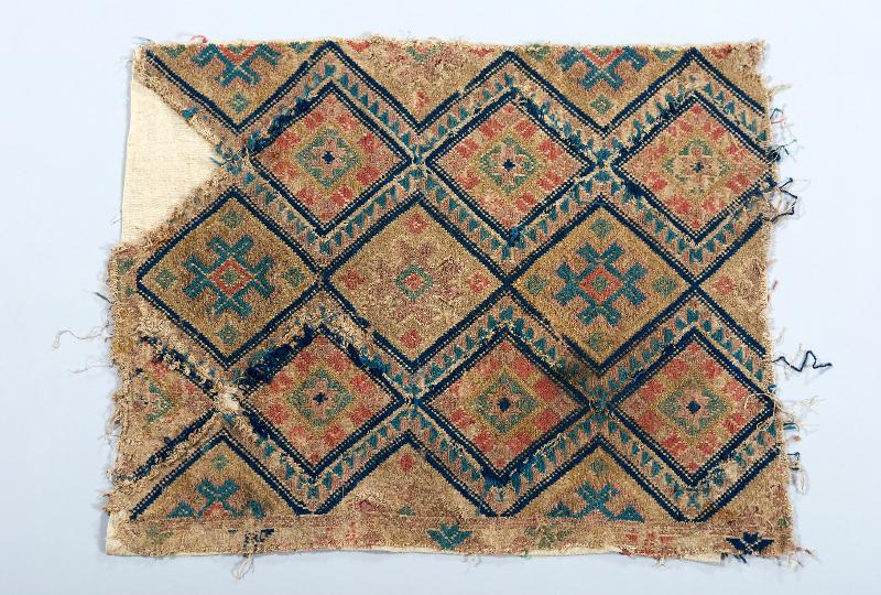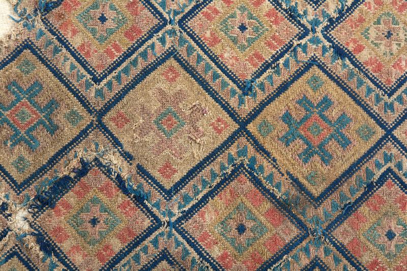 • Mönsterinslag av ylle i mörkblått, ljusblått, rött, grönt, brunt, gult, violett, vitt (nu beige). Gråvit linnebotten.