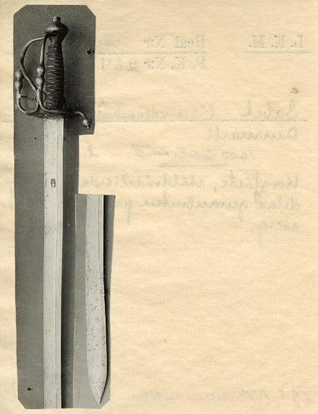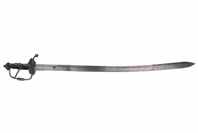 Eneggad, svagt böjd klinga, något bredare mot spetsen. Skålslipad längs ryggen. Cirka 18 cm från udden tveeggad. Stämpel med mansfigur. Fäste av järn. Åtta-formad parerplåt med kraftig bygel i ytterkant, plåten hålgenombruten. Parerstång s-formad, nedböjd framåt. Avslutad med kula. Bakåt direkt övergående i handbygel, vilken har två kulformade förtjockningar. Mellan hand- och sidobygel en spång. K...