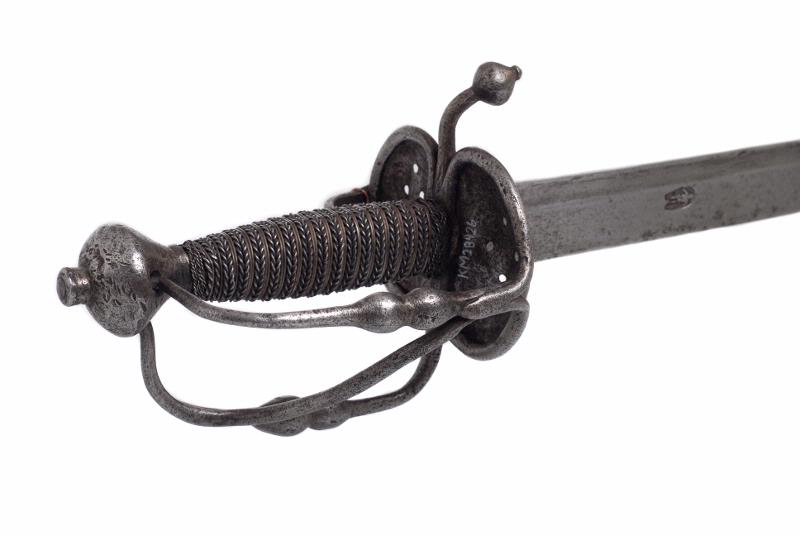 Eneggad, svagt böjd klinga, något bredare mot spetsen. Skålslipad längs ryggen. Cirka 18 cm från udden tveeggad. Stämpel med mansfigur. Fäste av järn. Åtta-formad parerplåt med kraftig bygel i ytterkant, plåten hålgenombruten. Parerstång s-formad, nedböjd framåt. Avslutad med kula. Bakåt direkt övergående i handbygel, vilken har två kulformade förtjockningar. Mellan hand- och sidobygel en spång. Knapp med dubbelkonform, hög nitknapp. Kavel av trä, lindad med tvåparts motställd samt enkel järntråd (troligen senare). På kvartssidan tumbygel.