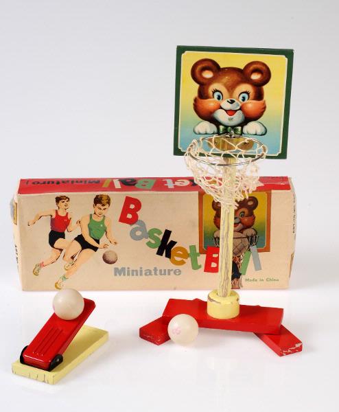 Innehåller två bollar med rosa tuppstämpel. Basketkorg med ställning. Korgen är avtagbar, liksom foten. Korgen består av en metallring och ett knutet nät, som bildar en cylinder. Ställningen är en rak pinne, målad i en ljus citrongul färg. Färgen har släppt och krackelerat på flera ställen. Brickan har ett björnmotiv med gul och grön bakgrund. Björnen har vit nos och vita handskar, grön fluga och blå ögon; av papp påklistrad på träskiva. Ett metallspänne sitter i nedre kanten av brickan. Foten är röd och gul och gjord i fyra delar; en cylinderformad vari pinnen till ställningen ska i och tre röda, där två är rörliga för att skapa balans. Foten är inte målad undertill och delarna är fastsatta med spik. Färgen släpper på stödens kortändar och blottar den vita grundfärgen. Ivägskjutningsmanick i gult och rött. Bottenplattan är i guldmålad trä varpå en metallplatta med fjäder är fäst. I metalldelen är ett hål varpå bollen sätts för att sedan skjutas iväg. Under träplattan är MADE IN CHINA tryckt. Bitarna ligger i originalkartong, som öppnas i botten. Askens ovansida är ljus med två basketspelande barn till vänster. Till höger finns en bild på innehållande basketkorg. Texten BasketBall Miniature och Made in China är skrivet i olikfärgade bokstäver och går mellan motiven. Även askens kortsidor är ljusa och innehåller motiv från innehållet (korg och skjutanordning med boll) Texten ART. NO WG 025 strå i svart på båda sidor. Långändarna är i rött med spelets titel tryckt i vitt, grönt, gult, svart och ljusblågrå, precis som texten på ovansidan.