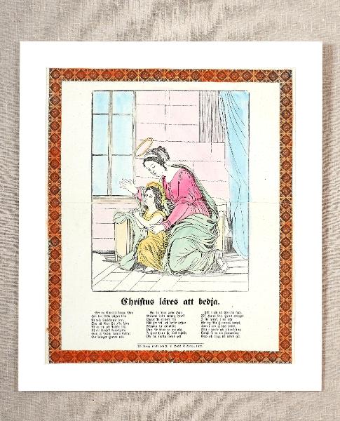 Jungfru Maria och Jesus sitter i en liten soffa i mitten av bilden. Maria höjer sin högra hand och sitter något böjd över Jesus som knäpper sina händer i bön. Till vänster ett stort fönster och till höger ett draperi.