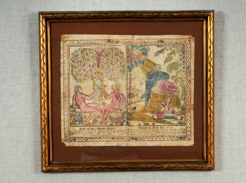 Bild 1- Adam och Eva i Paradis Lustgård. Bilden visar Adam och Eva som sitter på ömse sidor om kunskapens träd. En orm slingrar sig över en gren i trädet och Eva tar äpplet som ormen sänker ner till henne, och Adam sträcker ut handen. På marken i förgrunden finns en hund, en kanin, en elefant, en groda, en snigel, en hjort, en gris och en ko. Uppe i trädkronan hänger mycket frukt och i mitten ett krucifix. Bild 2- Abraham såg Christi dag. Isak ligger på ved på ett altare som är gjort av två stenblock. Abraham håller en kniv i högra handen och tittar upp mot himlen där han ser en ängel bland molnen. Nedanför altaret står ett kärl med kol som ryker och till höger växer ett palmträd. Vid foten av trädet har en vädur fastnat i en törnbuske. På den något kuperade marken ligger stenar och det växer låg bredbladig vegetation.