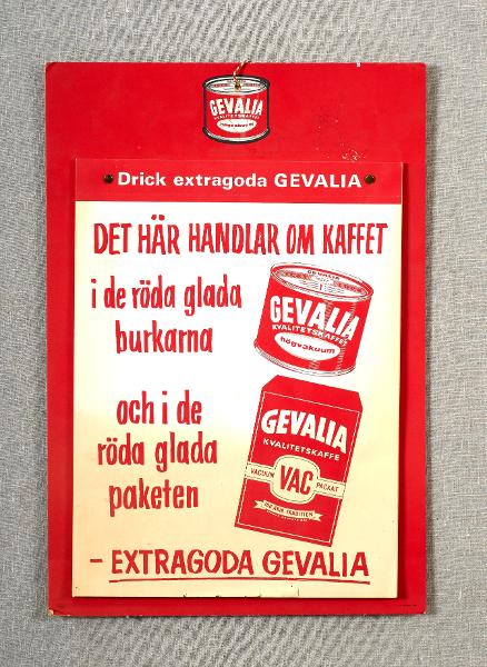 För Gevalia med tryck i rött och vitt. Längst upp på kartongskivan är en förpackning avbildad och på skivan är ett block med flera blad monterat. På första bladet texten: Drick extragoda GEVALIA, DET HÄR HANDLAR OM KAFFET i de röda glada burkarna och i de röda glada paketen, -EXTRAGODA GEVALIA. Till höger om texten är två olika förpackningar avbildade. Blocket består av 10 blad reklamtext och 25 blanka blad där handlaren själv skulle skriva sina specialerbjudanden. Längst upp sitter ett snöre genom ett hål för upphängning, och på baksidan finns en flik för att kunna ställa skylten upp.Stäng