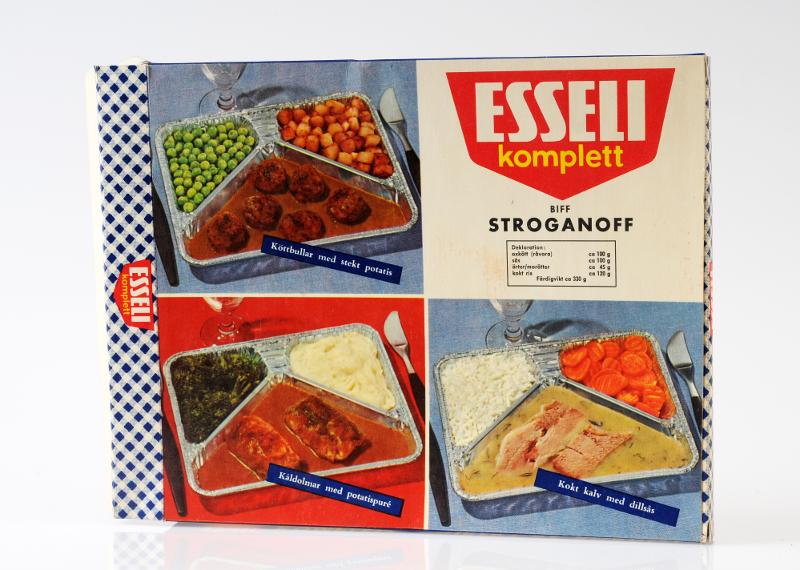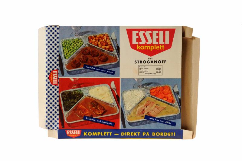 • vit med tre färgbilder av olika maträtter i folielådor (dock ej biff stroganoff); varumärke Esseli; på baksidan förvaring och tillagning