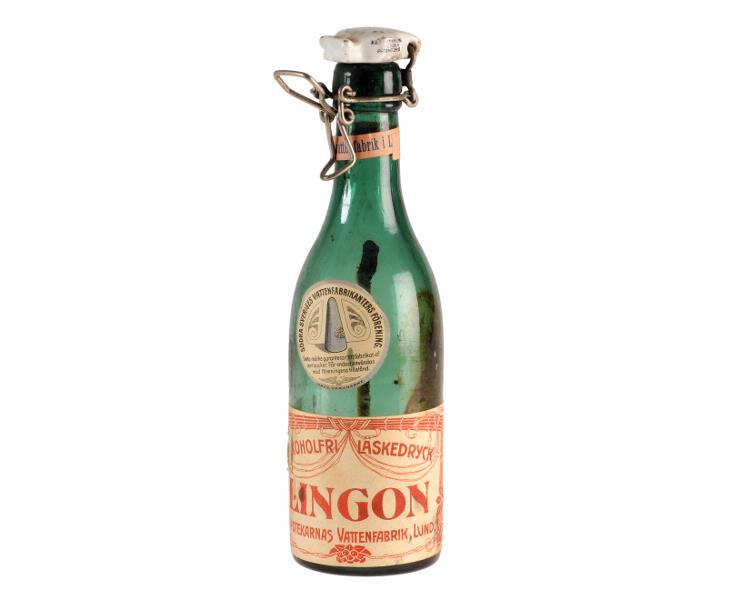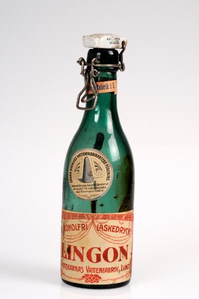 Grön cylindrisk med vit porslinskork. På halsen en etikett där det står: Akt. Bol. Apotekarnas Mineralvattenfabrik i Lund. Vid flaskans nedre kant en etikett med rött tryck på beige botten med texten: ALKOHOLFRI LÄSKEDRYCK LINGON APOTEKARNAS VATTENFABRIK, LUND. Kring texten en ram med girlanger och lingon. Ovanför etiketten ett runt garantimärke med tryck i blått på beige botten.