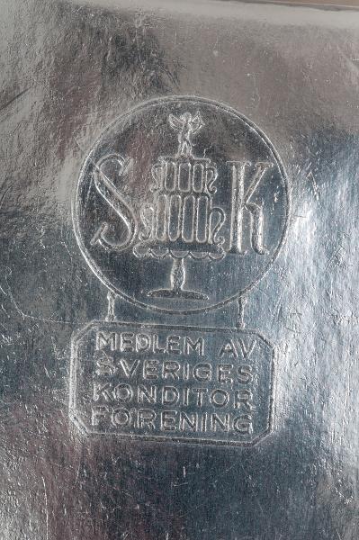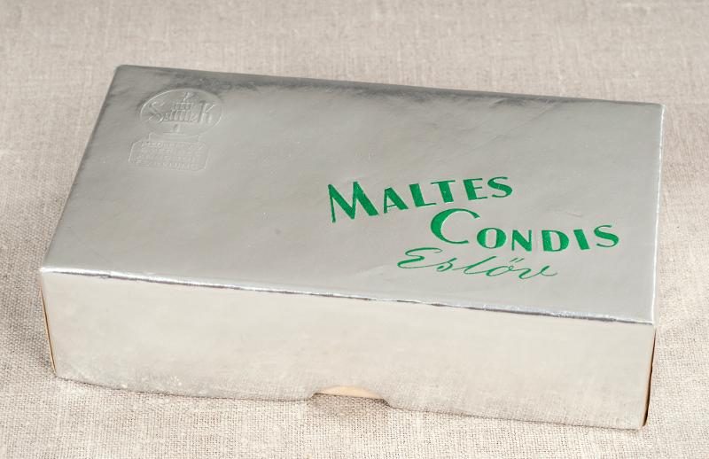 • rektangulär, locket silverfärgat med text i grönt: Maltes Condis Eslöv.