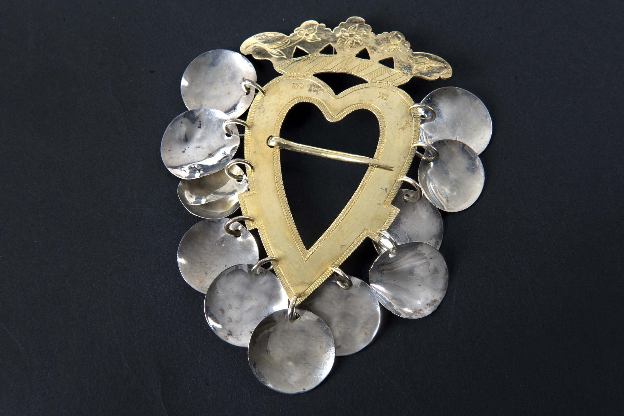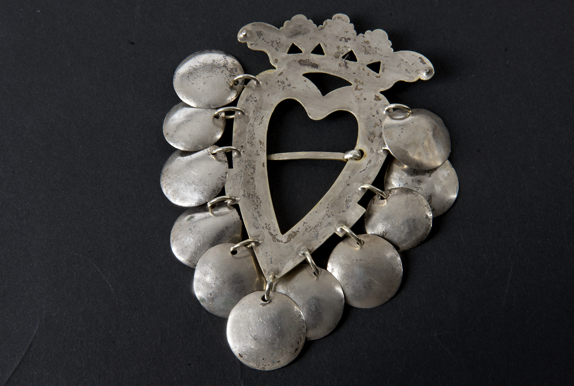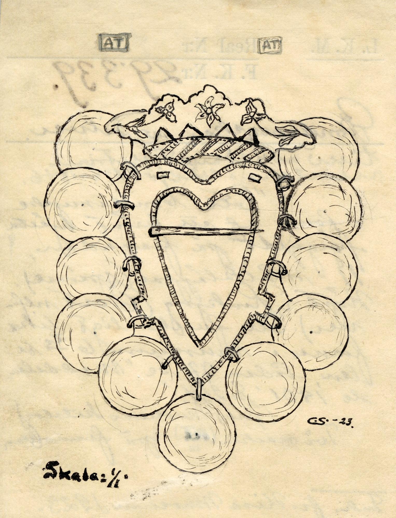 • Hjärtformigt, krönt med genombruten krona med graverad dekor av bl a blommor och blad. Hjärtats kanter med graverad streckdekor. 11 runda skålade löv, alla utan dekor och i samma storlek. Framsidan förgylld, på löven spår av förgyllning.