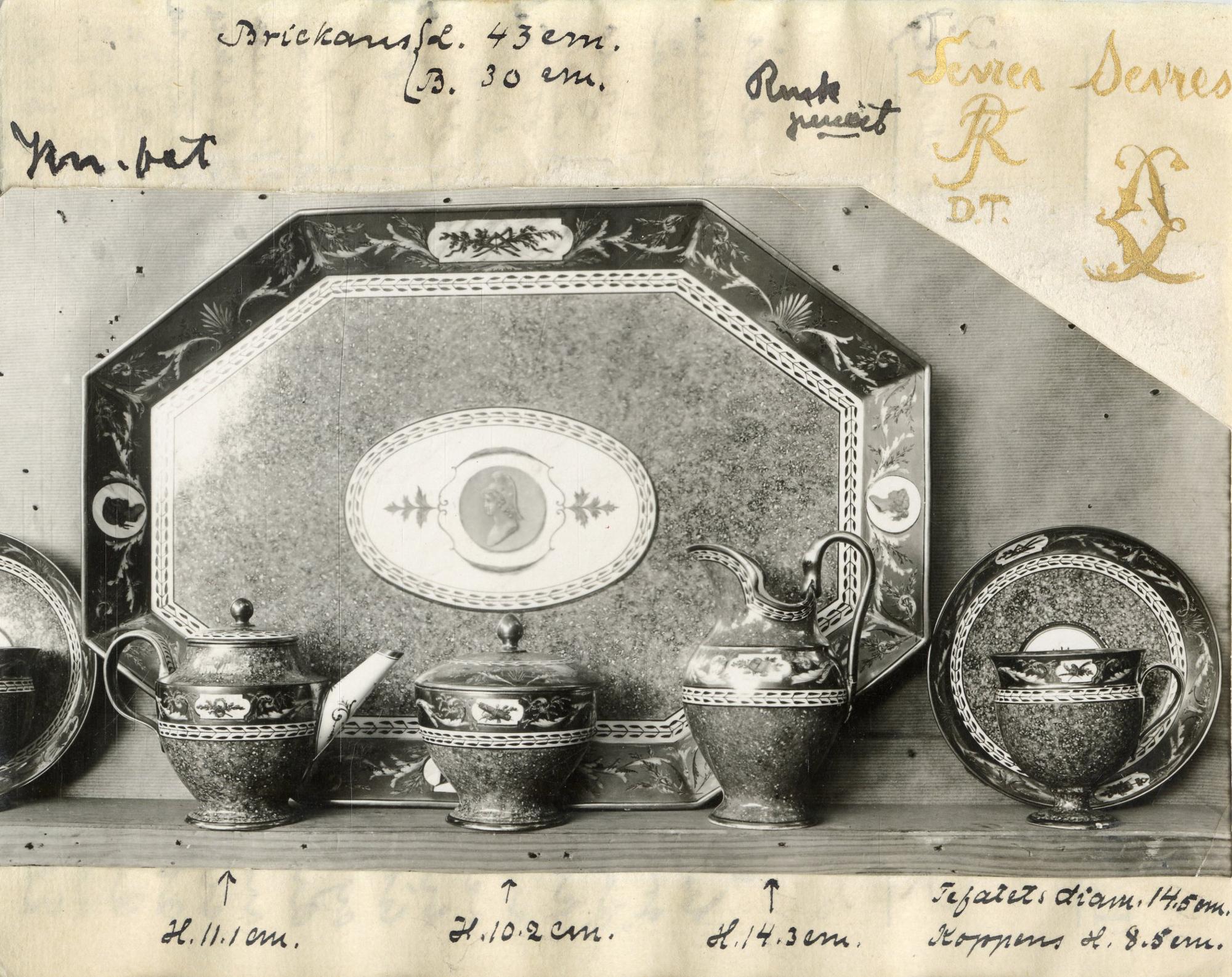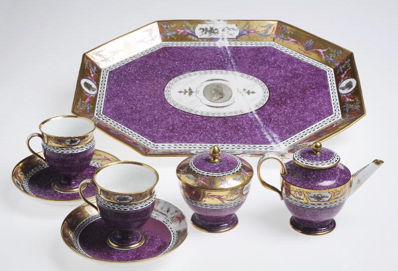 • Dekor målad i porfyrimitation och guldbårder med överglasyrmåleri i flera färger. Servis för två.