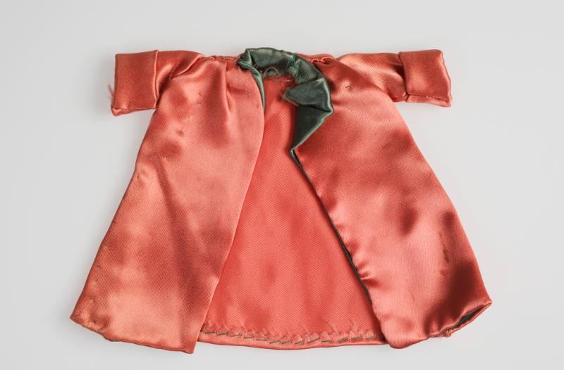 • Rosa aftonkappa med grön krage och grönt foder i framsidan. Utsvängd modell.