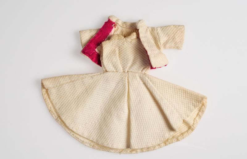 Dräkt. Dockklänning: Vit, ärmlös klänning. Två tryckknappar i ryggen. Klockad kjol. Dockjacka: Vit, korta ärmar. Fodrad med rosa band längs jackans framkanter och nederkant.