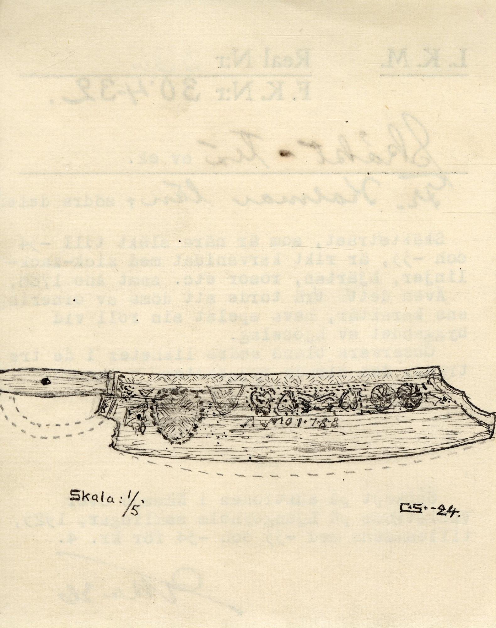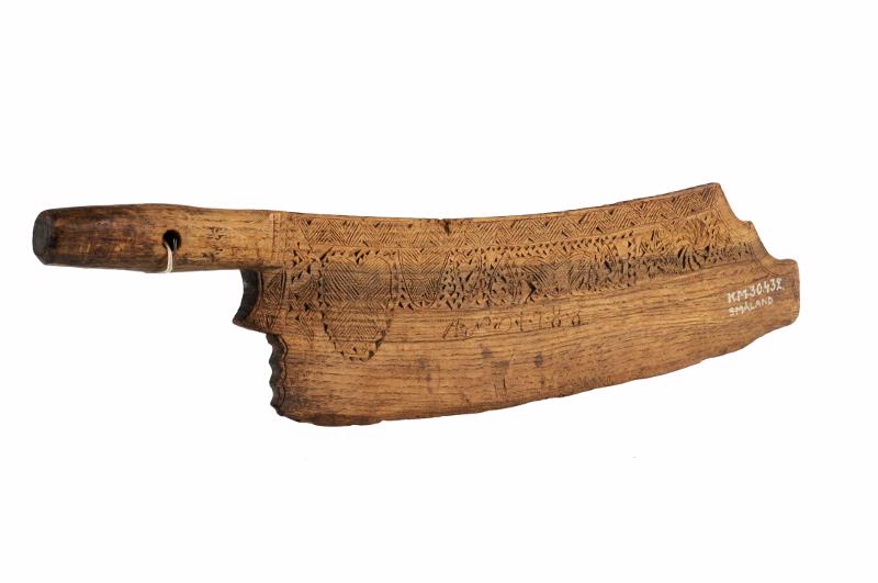 • Rektangulär, något svängd skiva av eketrä. Handtag defekt med avslagen bygel. Spolformig kavel, genomborrad med 1 cm diameter hål. Brett avfasad ovankant med brett sicksackband i karvsnitt. På skivan utskuret mönster i rosetter och hjärtan samt A.N.O. 1788.