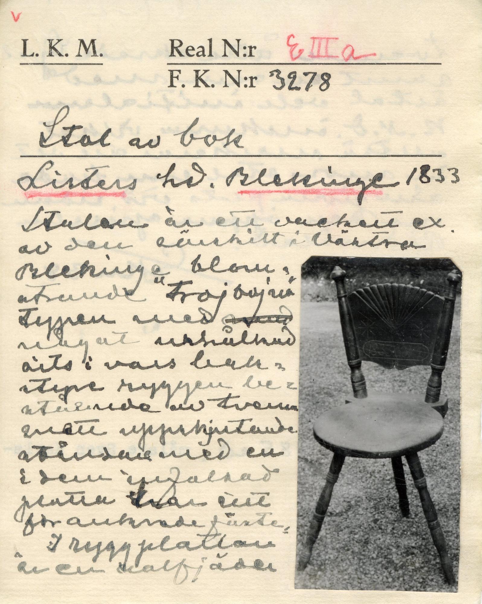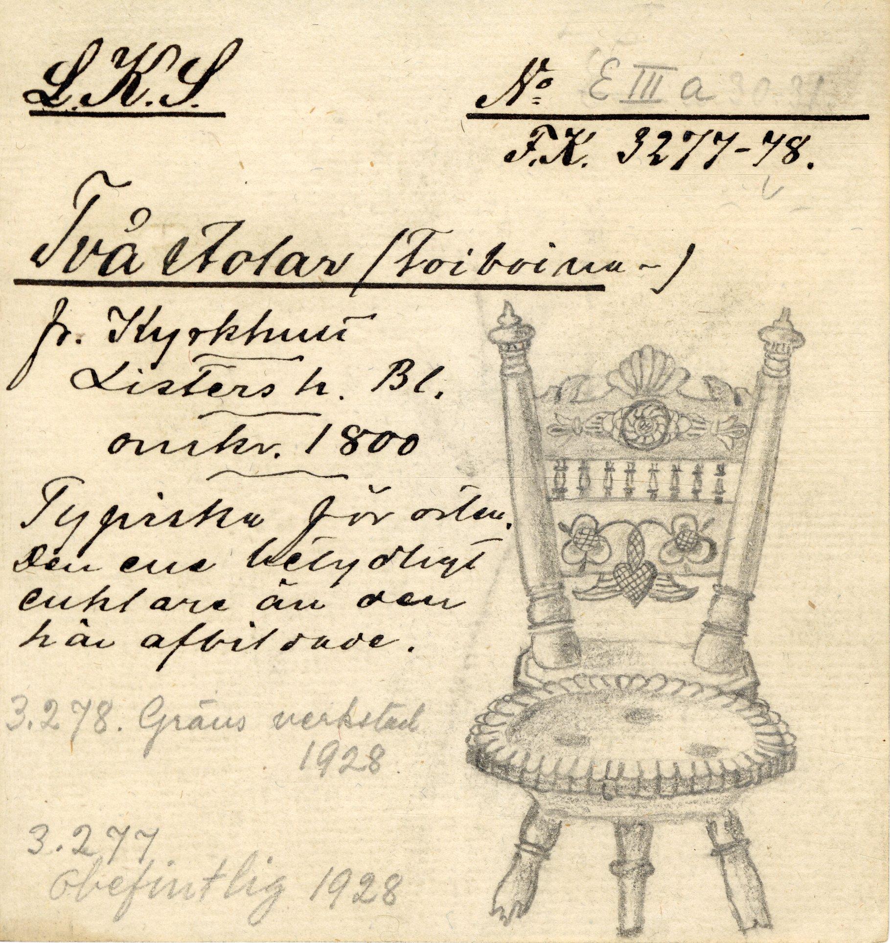 [Två katalogkort till KM 3277-3278] Två stolar (Troiboina-) fr. Kyrkhult Listers h. Bl. omkr. 1800 Typiska för orten. Gräns verkstad 1928. Stol av bok. Blekinge 1833. Stolen är ett vackert ex. av den särskilt i västra Blekinge blomstrande "trojbojna" typen med något urhålkad[sic!] sits i vars bakstyre ryggen bestående av tvenne snett uppskjutande ståndare med en i dem infalsad platta har sitt förankrade fäste. I ryggplattan är en solfjäder tvenne åttarmade hjul runt en ram med årtal och initialerna R.N.D. inskuret vilket alltså markerar att det är mors stol och hade sin givna plats vid sidan om den öppna spiseln Rödmålad. Uppk. 1885 av målare Sven Karlsson för kr.2.