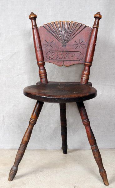 Med tappkonstruktion och tre ben. Ryggbricka mellan ståndare. Något urholkad sits, ryggen består av två snett uppskjutande ståndare med en i dem infalsad platta. Inskuret ryggplattan är en solfjäder, två åttarmade hjul runt en ram med årtal 1833 och initialerna K.N.D. Rödmålad. [måttangivelser saknas] [Gräns verkstad 1928] [enligt Karlin]