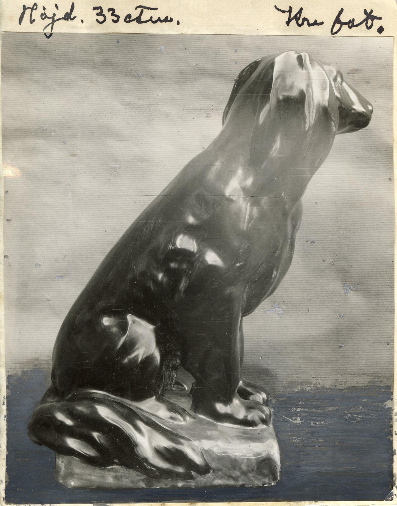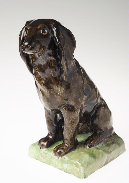 • Hund av obestämd ras, brun päls, sitter på en grönmålad kvadratisk platta.