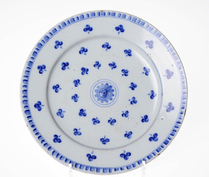 • Gråblå glasyr med blå dekor, klöverbladsmönstret.