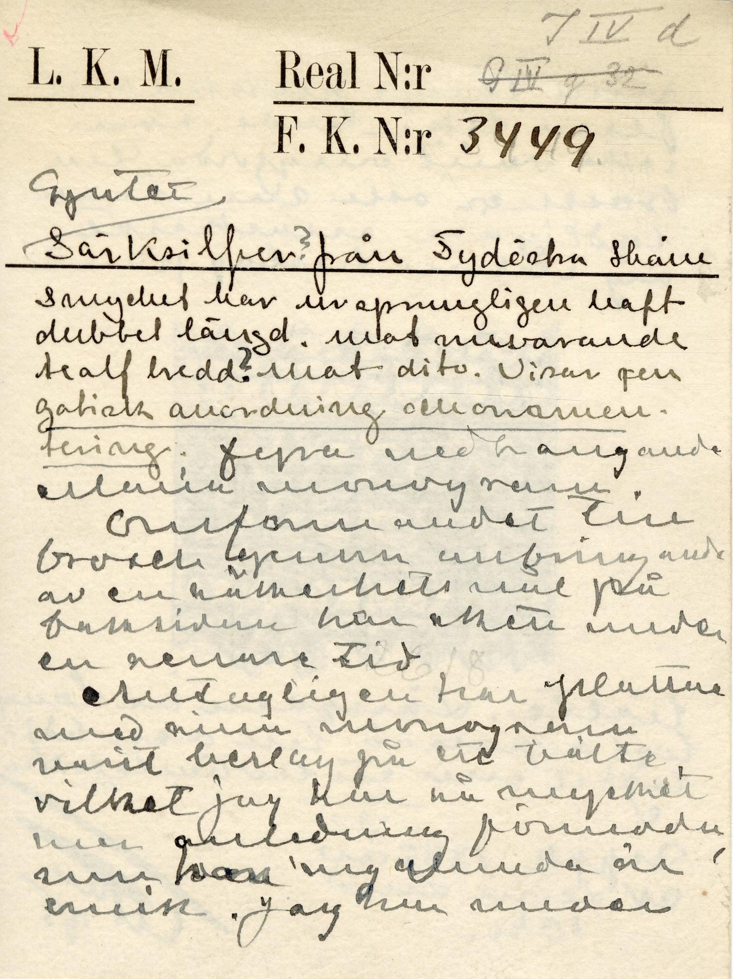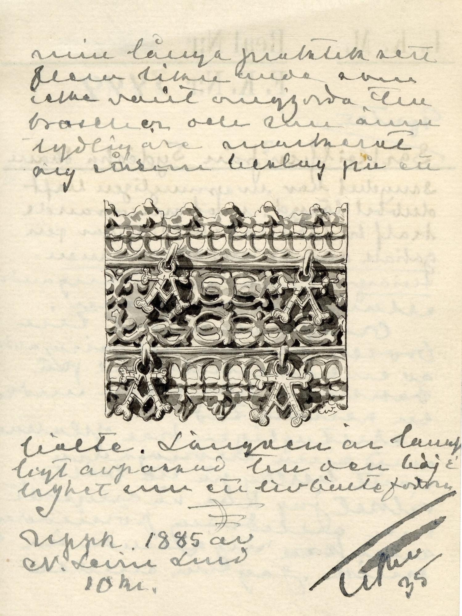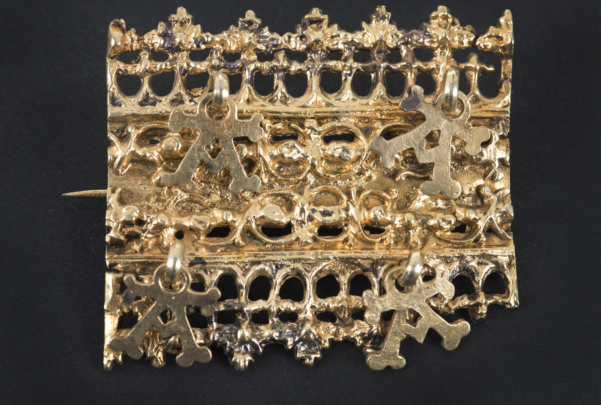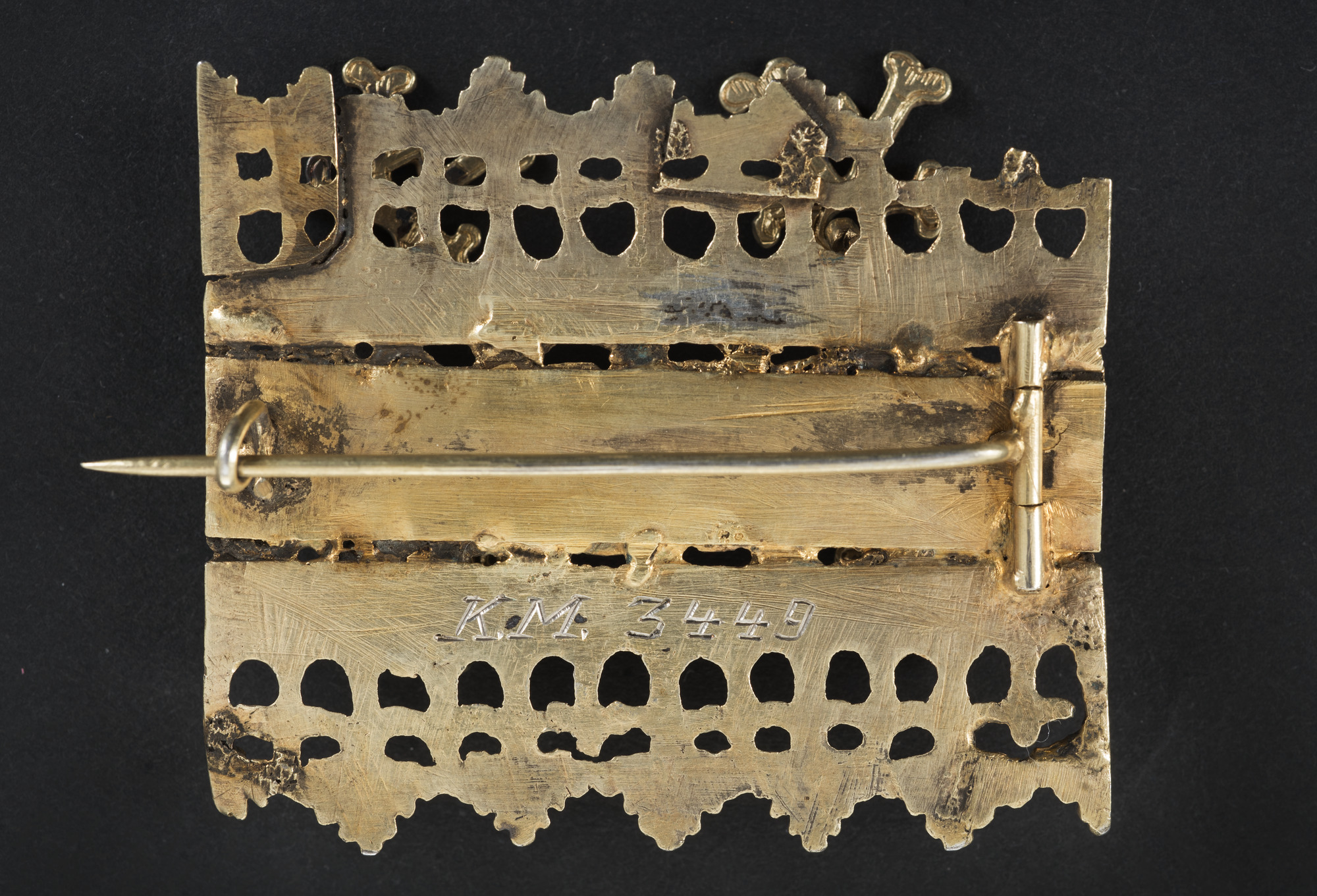 Helt förgyllt. Gjuten, genombruten platta med uddkanter med valvbågar i gotiserande stil. Skadad i ett hörn. 4 st Maria-löv. Nål på baksidan. Lagat på tre ställen.