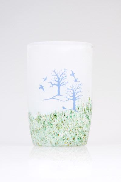 Oval bottenform, något tillplattade långsidor. Något avsmalande längst ned. Vit bottenfärg, nedre tredjedelen stänkmålad i olika gröna nyanser samt brunt, ska likna en äng eller gräsmatta. Ovanför detta på vardera sidan tryckt dekor i blått föreställande 2 träd samt 4 fåglar.