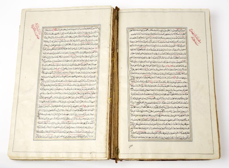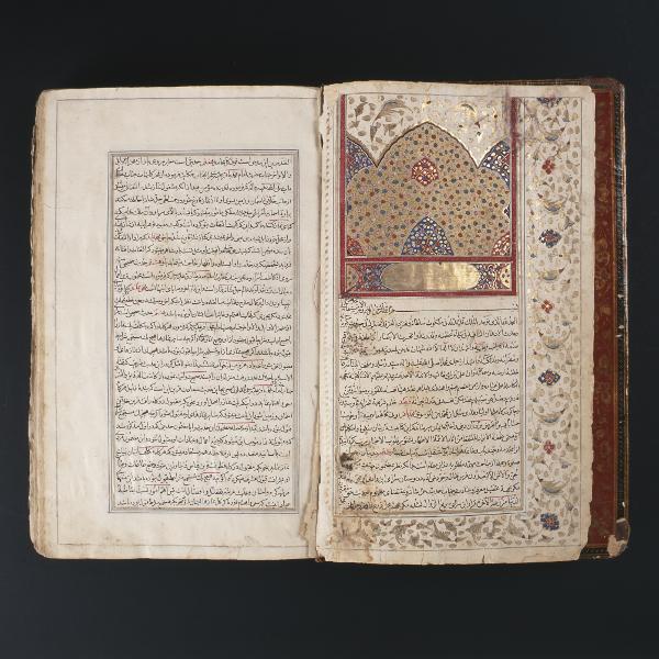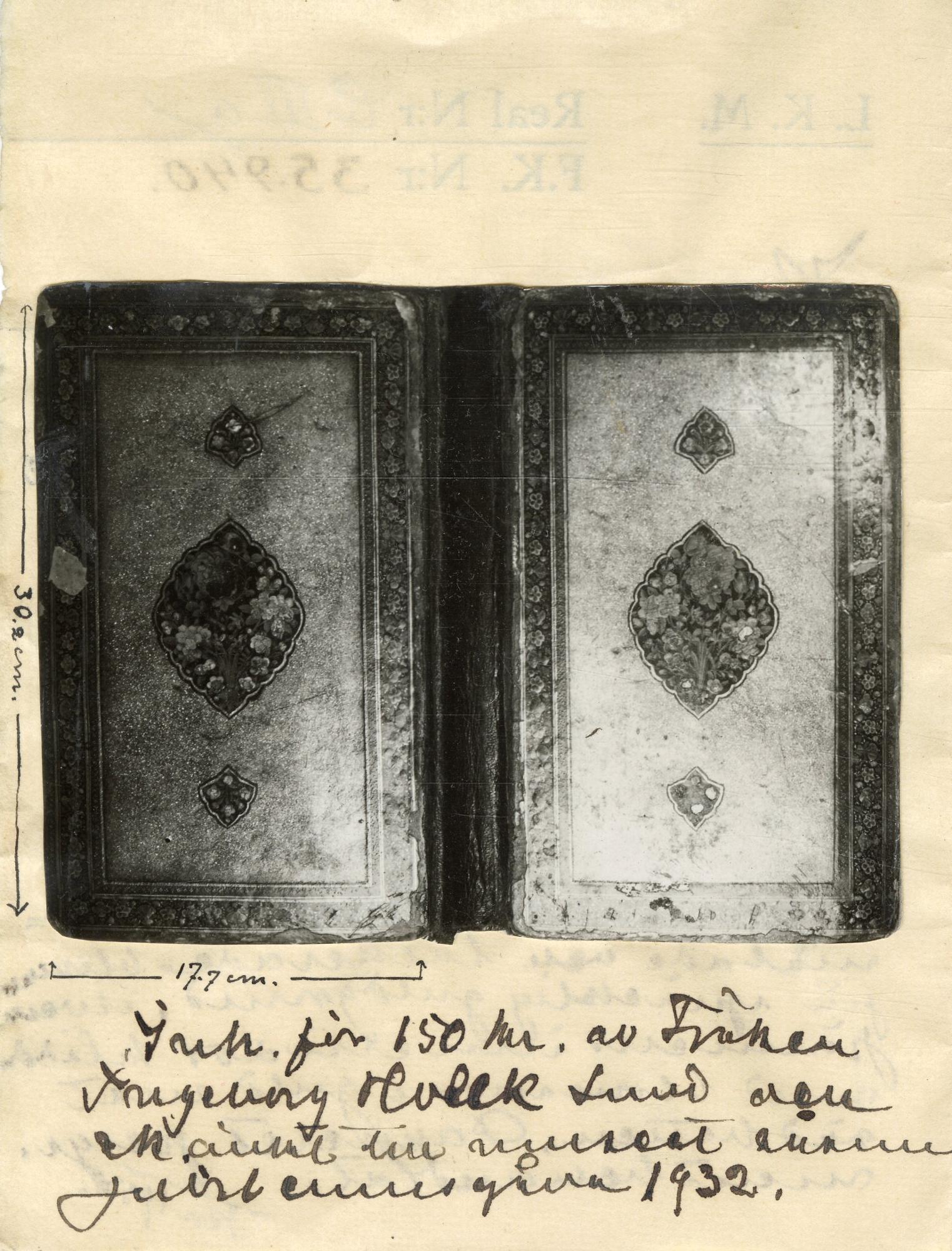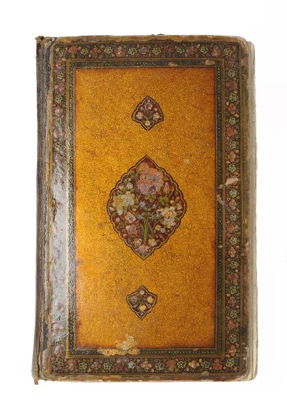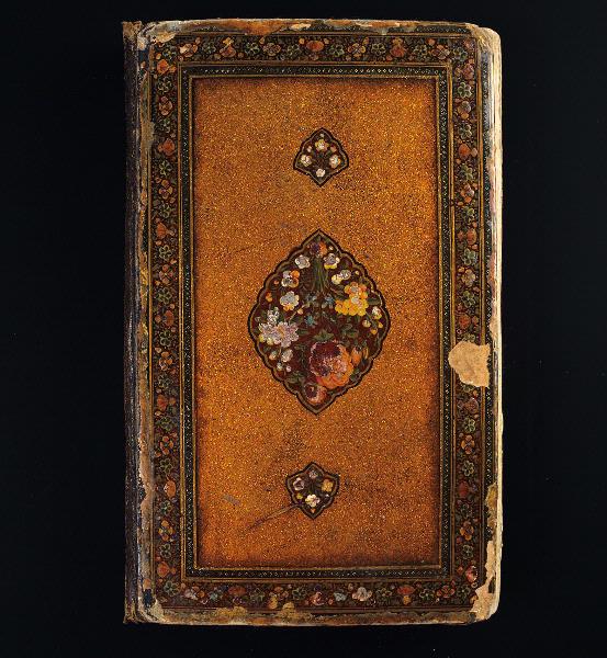 Illuminerad handskrift. Pärmarna är utförda av skinnklädd papp, som lackerats i rik blomsterdekor mot guldgrund. Även pärmarnas insidor är lackerade med gyllene bladslingor mot röd bakgrund. Skriven både på arabiska och persiska.