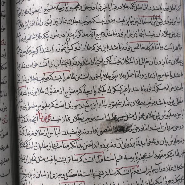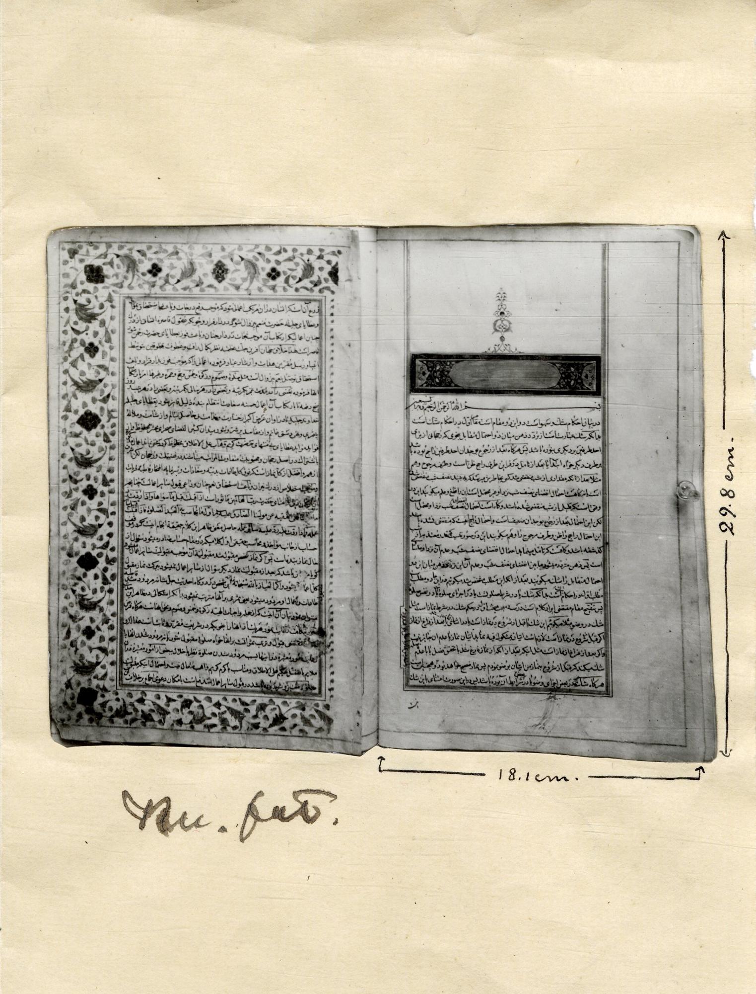"Pärmarna är utförda av skinnklädd papp, som lackerats i rik blomsterornamentik mot guldgrund. Även pärmarnas insidor är lackerade med gyllene bladslingor mot röd bakgrund. Bokens textdel består av papper av europeisk, möjligen portugisisk, tilvlerkning. Pappret är starkt limmat eller 'planerat', d.v.s. doppat i en lösning av lim och alun, varefter bladen glättats genom gnidning med agat. Denna glättning kunde i senare tid ske genom att bladen pressades mellan blankslipade stålvalsar. Volymne innehåller en 276-sidig handskrift i två delar, en större och en mindre, i vackert persiskt utförande.Verket saknar titel; det innehåller i löpande följd påstående och frågeställningar, som kommenteras på ett blandat arabiskt och persisktspråk. Anonymiteten behöver inte nödvändigt vara tillfällig; det kan ha varit fördelaktigt att låta skriften sakna ursprungsbeteckning. Första sidorn i de båda delarna är rikt dekorerade i flera färger, och de övriga textsidorna är vackert inramade i guld. Textens skönhetsintryck förhöjes ytterlgiare genom att nyckelorden skrivit med rött bläck. Med rött bläck har skrivaren dessutom dragit ett streck ovanför vissa ord, vilket motsvarar vårt sätt att stryka under. På vardera av de båda delarnas sista sidor finns en liten notis - av en andra hand - som intygar, att verket kollationerats. Då handskriften saknar varje som helst datering, är det imöjligt att yttra sig om dess exakta ålder. I bokexemplaret ingår papper med minst 4 olika vattenstämplar. En undersökning av dessa tillverkningsbeteckningar ger vid handen, att boken inte kan ha färdigställts före 1700-talet. " Kulturens årsbok 1962, Gösta Vitestam, En arabisk handskrift, s. 95-98.