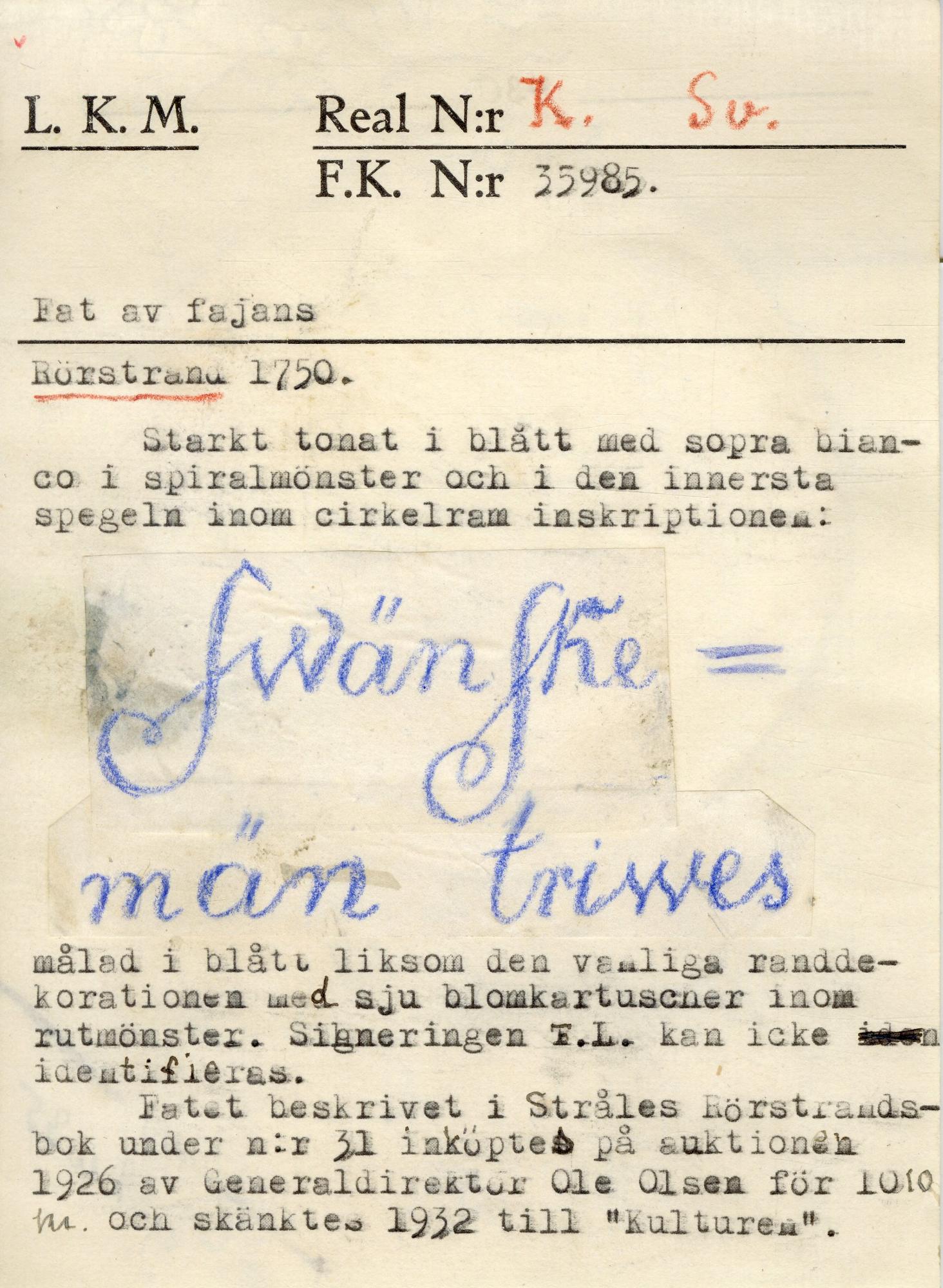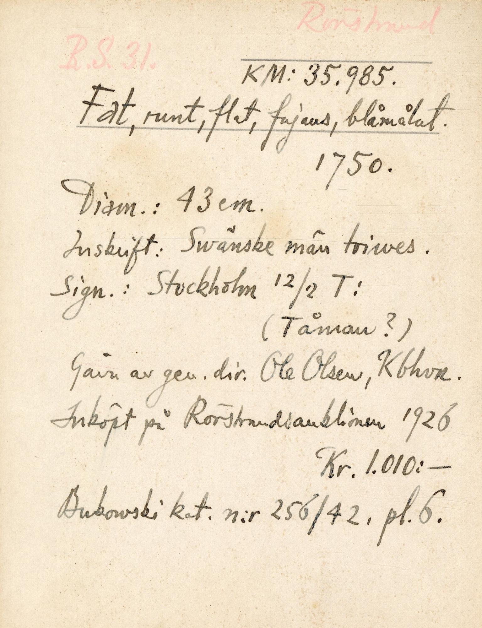Inköpt på Rörstrands-auktionen 1926, RS. nr 31, för 1010.00 kr. och skänkt av generalkonsul Ole Olsen Hesselhøj, Danmark.