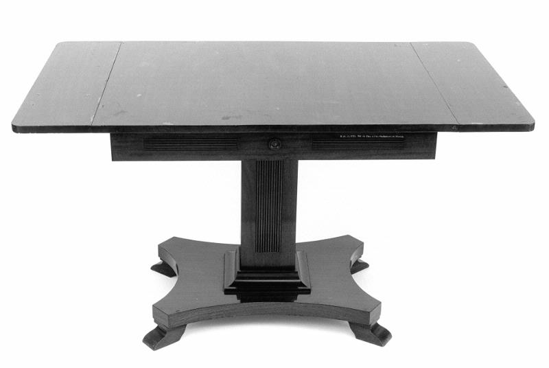Rektangulär skiva med två klaffar på kortsidorna. Fyrkantigt ben på platta med insvängda kanter och fyra fötter. Såväl benet som sargen har dekor av skurna linjer, vertikalt respektive horisontalt.