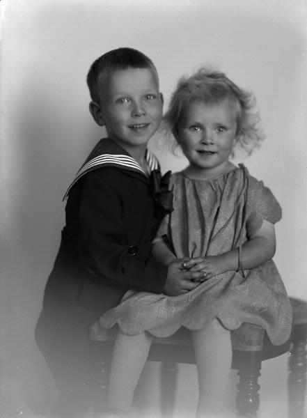 • Ateljébild. Porträtt av en pojke i sjömansdräkt med lillasyster sittande på en pall. Fotograferat i helfigur. Beställare: H. Carl Nilsson.