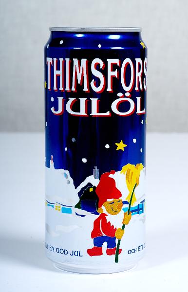 Cylindrisk ölburk med tryck i flera färger på mörkblå botten. På övre delen står: THIMSFORS JULÖL. Resten av ytan upptas av en tecknad bild av ett vinterlandskap. I förgrunden står en tomte och håller i en julkärve, och i bakgrunden står byggnader. Övre delen är fylld av stjärnor och snöflingor. I nedre kanten texten: THIMSFORS ÖNSKAR EN GOD JUL OCH ETT GOTT NYTT ÅR.