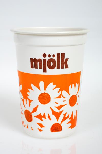 Cylindrisk förpackning med tryck i brunt och orange på vit botten. Större delen av ytan upptas av en tecknad bild av prästkragar på färgad botten. Det finns också en innehållsförteckning och där under logotypen för Helsingborgs mjölkcentral. I övre kanten står: mjölk. Märkt i botten PLM 250 / 35 / 53.
