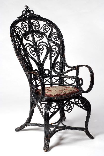 Svartmålad [enligt huvudliggare brunlackerad] med armstöd, stoppad sits, klädd med korsstygnbroderi, samt en lös nackdyna med, också denna med korsstygnsbroderi. Cabrioleben, rundade armstöd, ryggen med intrikat flätmönster och krön. Slåar, x-kryss.