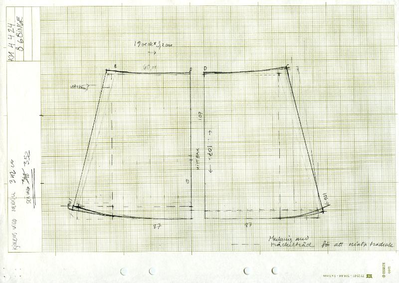 Kjolen är hopsydd från avigsidan med efterstygn. "Besparingarna" vid höfterna är isydda med förstygn och överkastade. Kjolen är veckad, goffrerad(?) i cirka 3,5 cm breda veck. Mitt bak bildas ett motveck eftersom vecken är lagda mot varandra från framstyckena. Fickan är hopsydd med efterstygn och kanterna är överkastade. Ficksprundet är liksom sprundet mitt fram skott med kjolens tyg, kastat fast på öppen kant. Fållen har vikts in och ett rött ylleband sytts över som skoning. Sømmesting. Kjolens tyg är mera blekt och nött på avigsidan, har den blivit vänd? Är det vid detta tillfälle som sömsmånerna klippts? Stadkanterna är kvar endast ställvis.