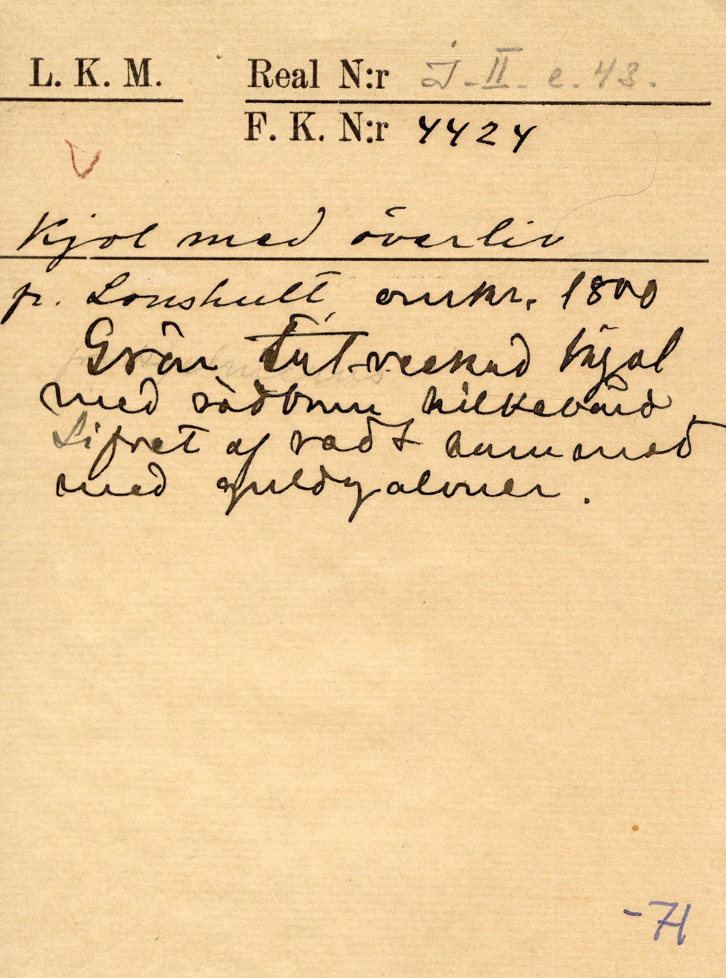 Över kjolens veckade överkant är en linneskoning fastsydd. Det går inte att se hur vecken sytts samman eller fästs. Linnekanten kan först ha sytts på och sedan fästs vid livet. Även här har en typ av sømmesting använts. Samma tyg i foder och linnkant.