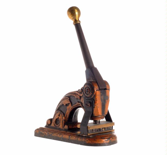 • Utan firmamärke, svartmålad med bronserad bladdekor i relief; endast den enas skaft har kvar mässingskulan i skaftets fria ände.