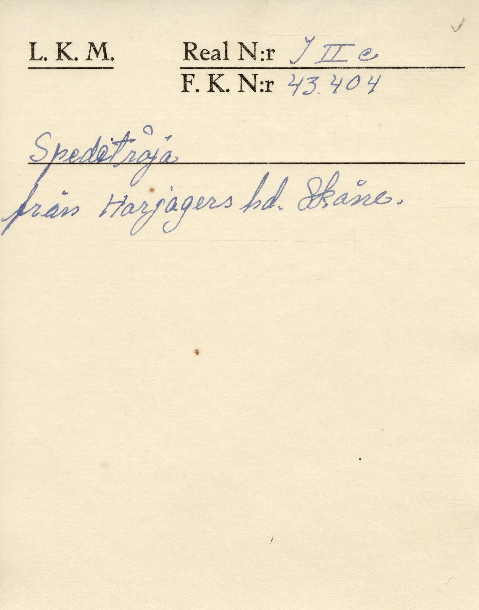 Utställningstext Folkkonst Design 2009: Spedetröjor stickades vanligen av professionella stickerskor. Ylletröjorna färgades in på färgeri för att sedan dekoreras hemma med köpta band. I sydväst var tröjan röd eller grön och utgjorde en viktig detalj i högtidsdräkten. Här var modellerna längre och ålderdomligare än i övriga Skåne.Stäng