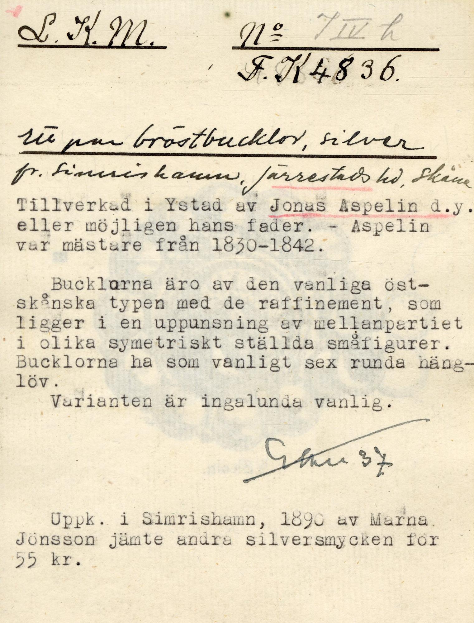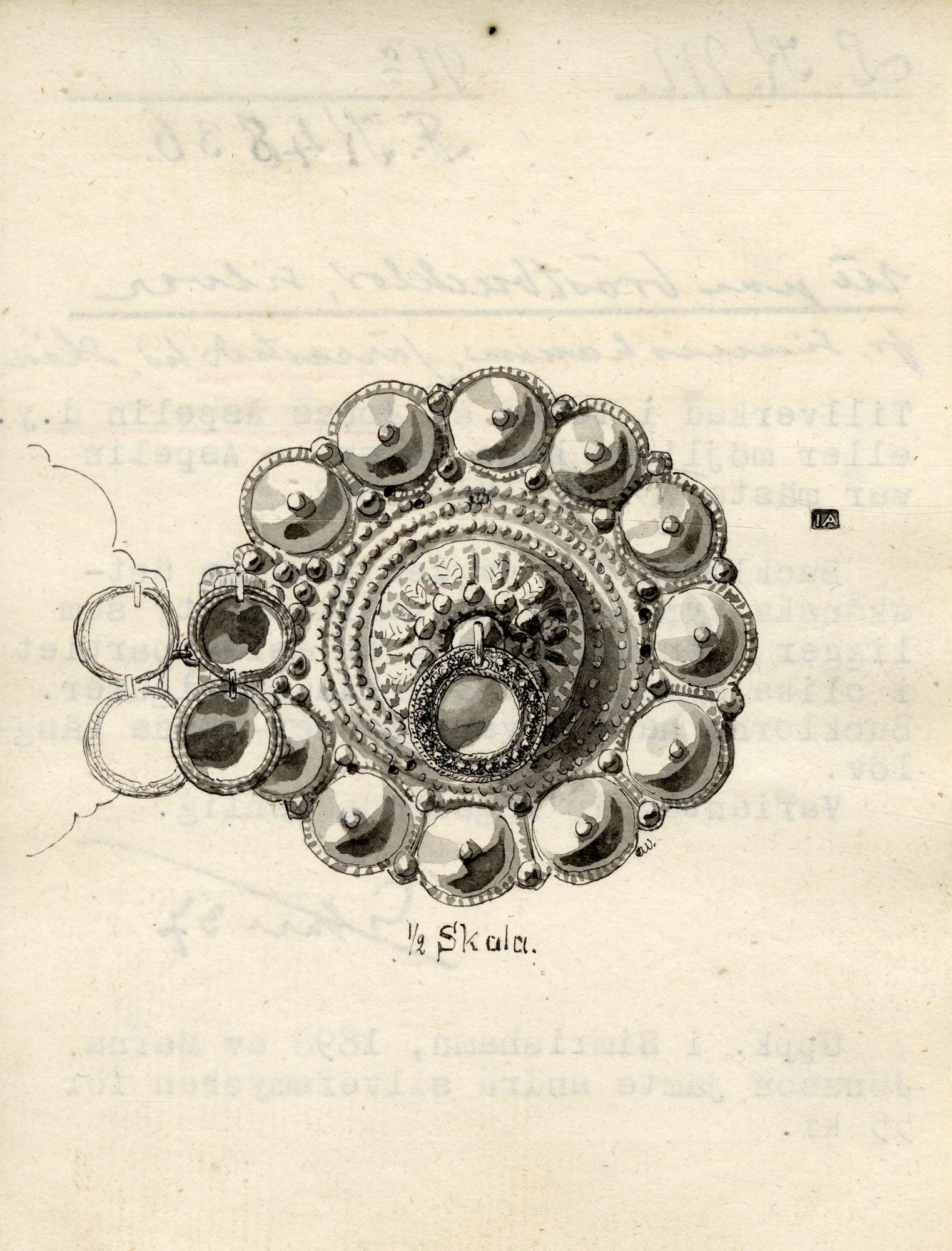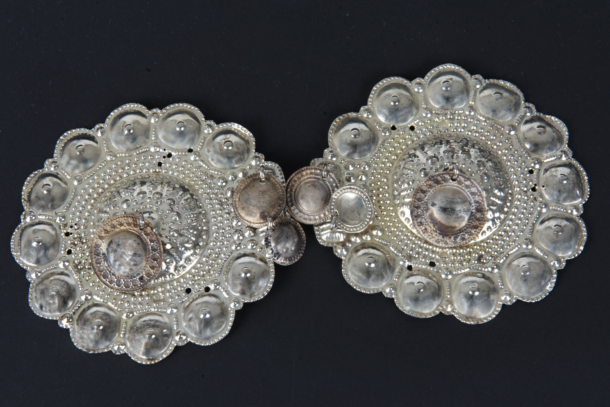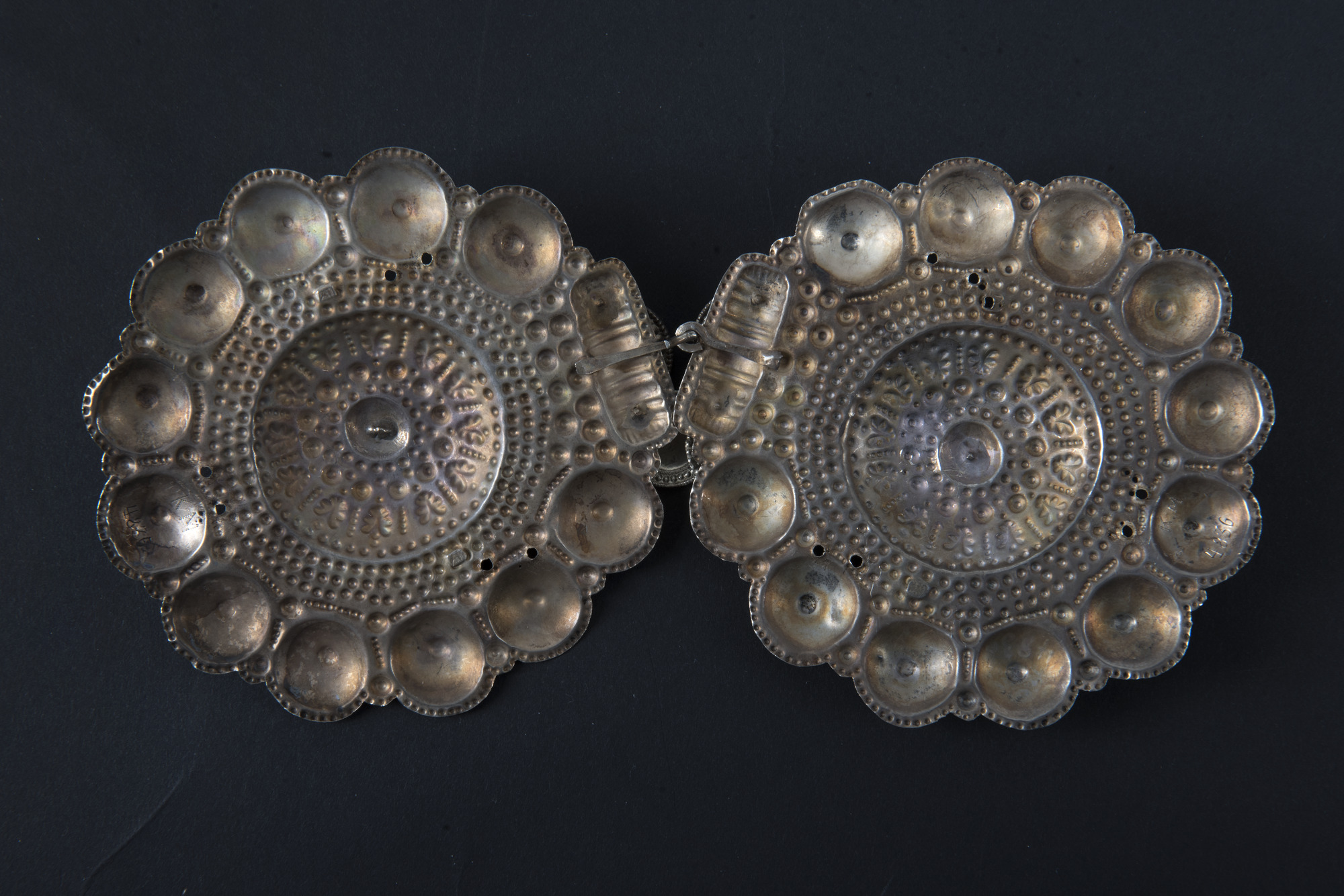 Framsidan förgylld. Uddkantade bottenplåtar med prickar och bucklor runt kanterna. I mitten runda bucklor dekorerade i relief med rd bård av tre rader med prickar mellan mittbuckla och kantdekor. I mitten på vardera bucka en ögla där ett runt löv med dekor av prickar är fäst. Två mindre löv med samma utformning kantar fästet för ögla och hake.
